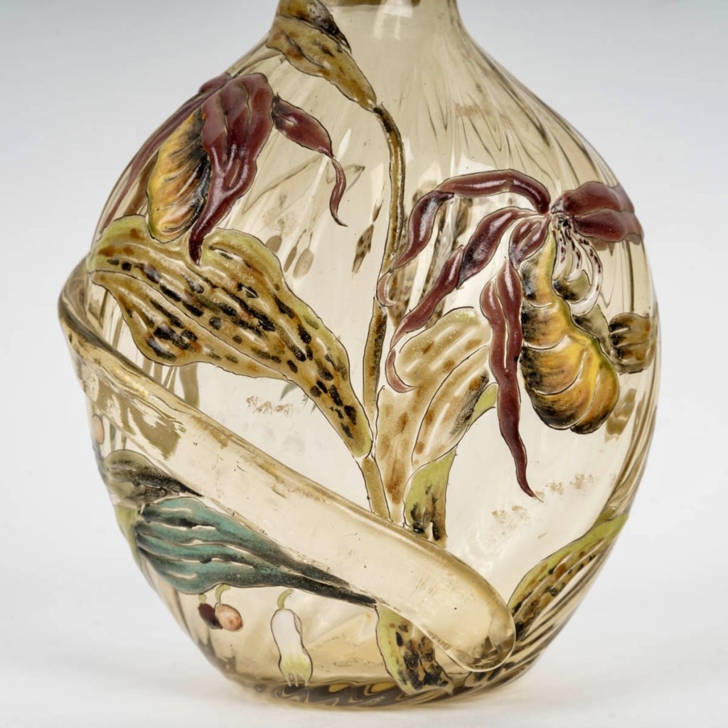 Carafe en verre jaune ambré émaillé d’Emile Gallé à décor de fleurs (sabots de Vénus) et d’un papillon créé dans les années 1890.