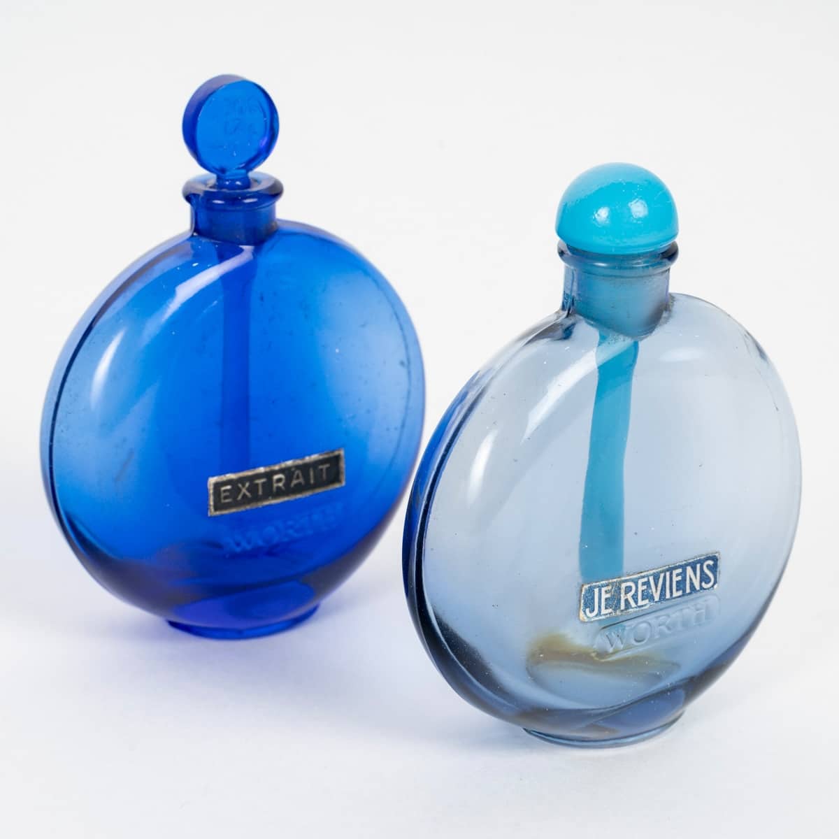Paire de Flacons « Je Reviens » et « Dans La Nuit » en verre bleu de René Lalique pour Worth. Bouchons testeur.
