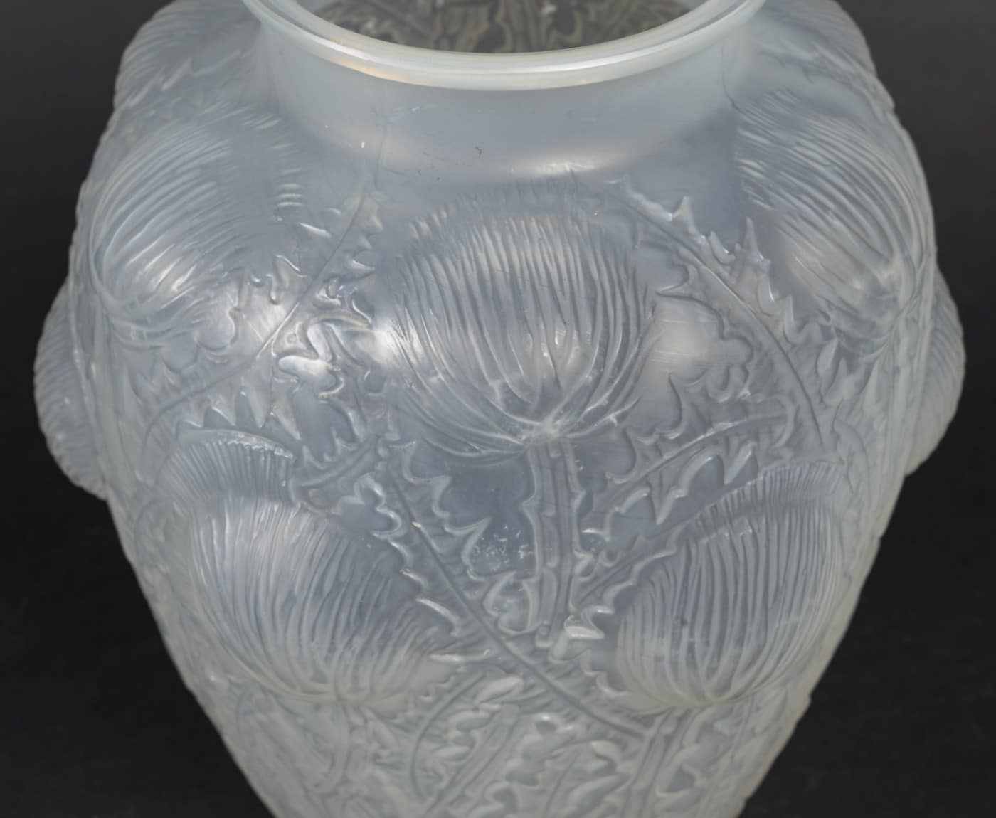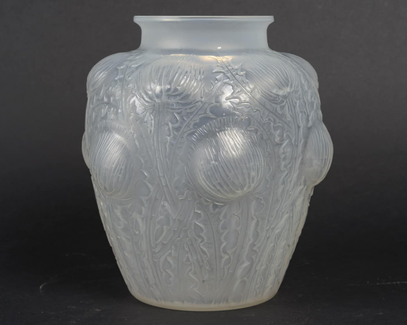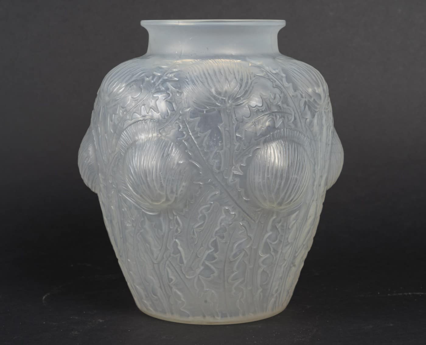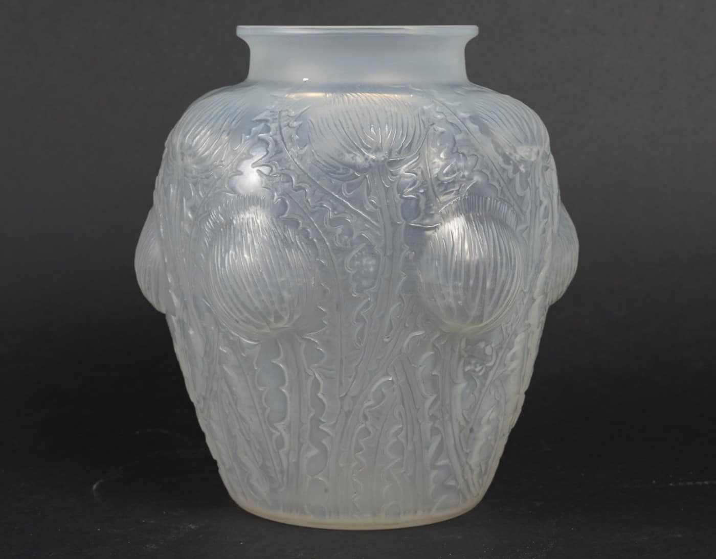 Vase “Domrémy” dit aussi « aux Chardons » créé le 16 novembre 1926 modèle en verre blanc soufflé, moulé, patiné opalescent et couleur (opaque).