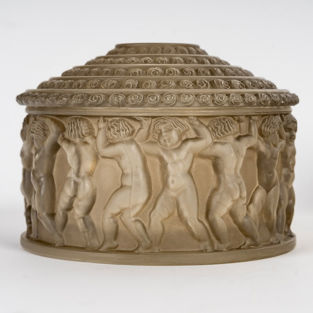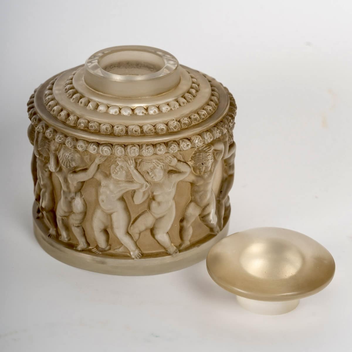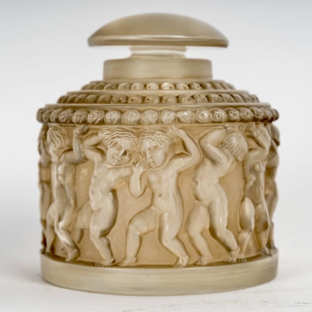 Boîte et Flacon « Enfants » en verre blanc patiné sépia de René Lalique créées en 1931.