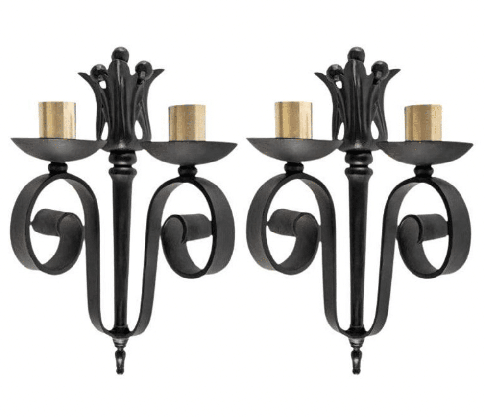 Sur chaque applique, au sommet des deux volutes réparties de part et d’autre, se trouvent deux coupelles habillées de deux cylindres en laiton doré servant de cache-bougies.
