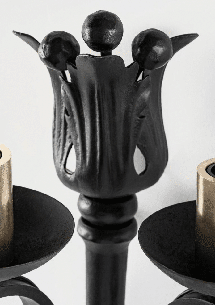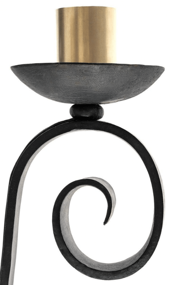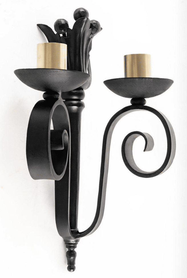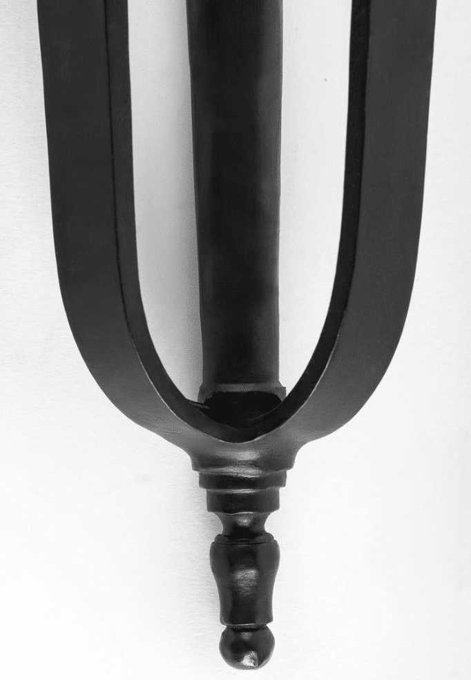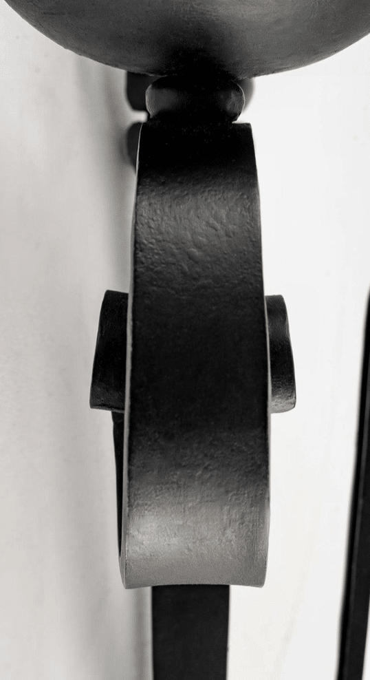Dans la partie inférieure de la tige centrale sont soudés deux bras de lumière formés de coupelles en fer forgé noir s’élevant en volute.