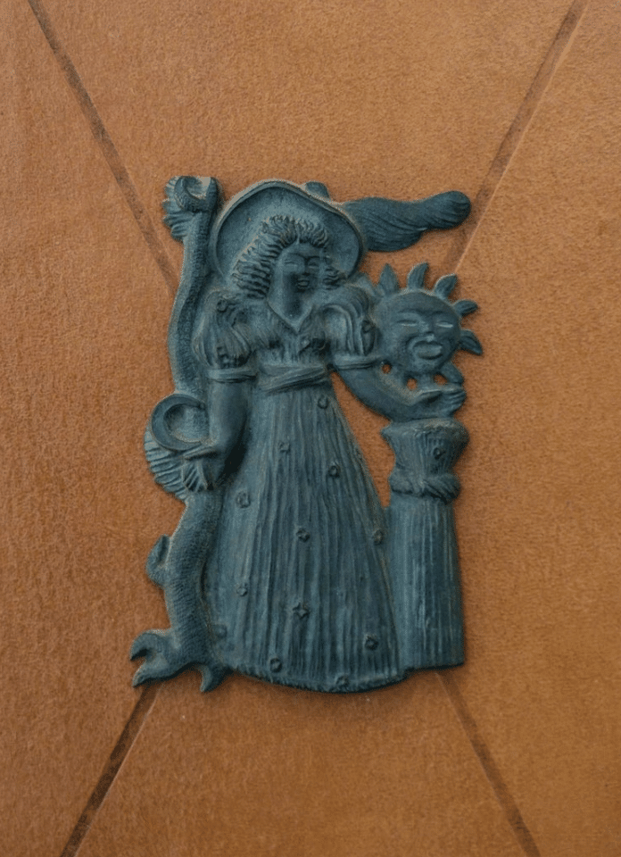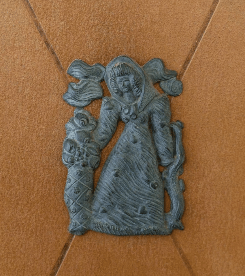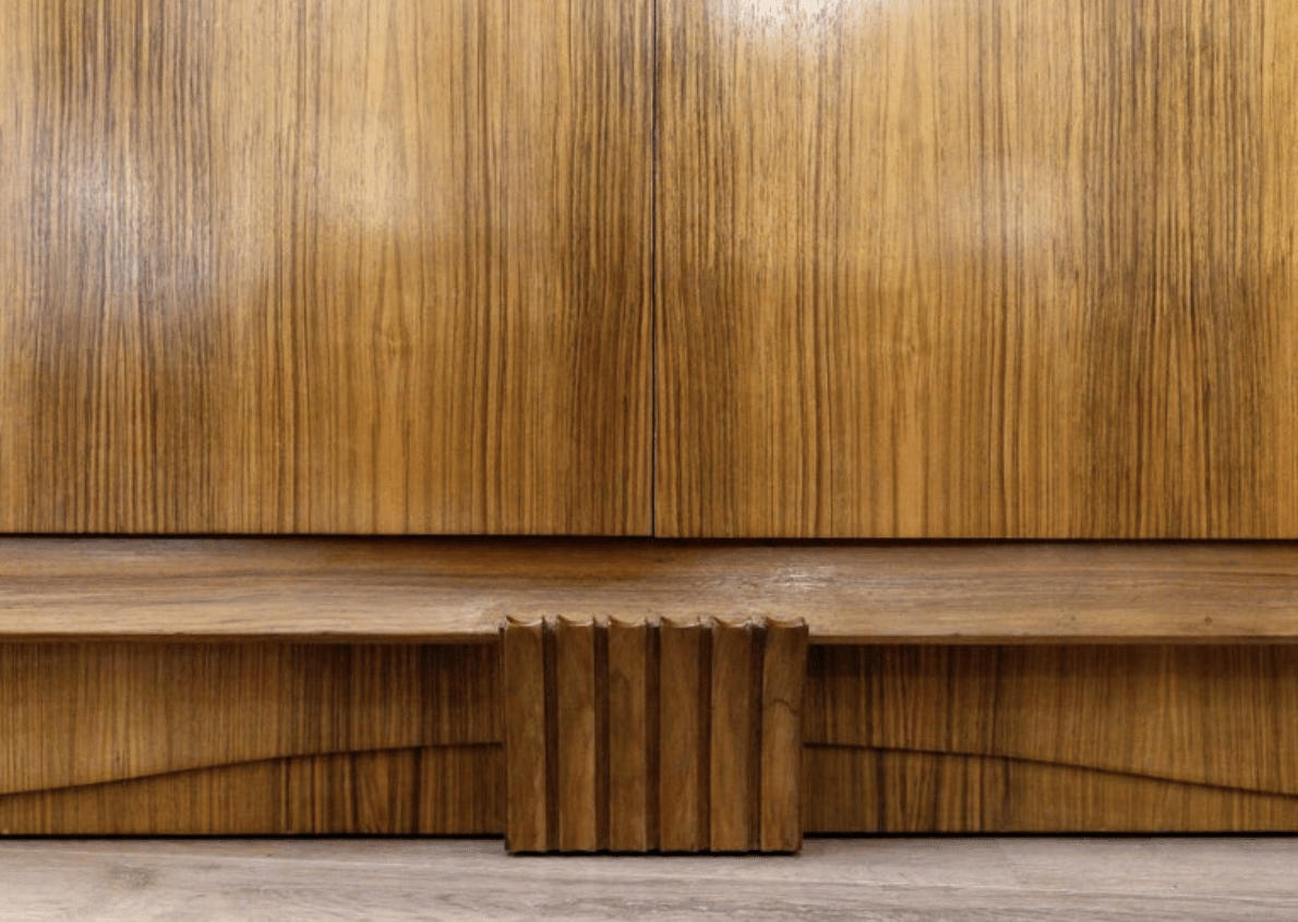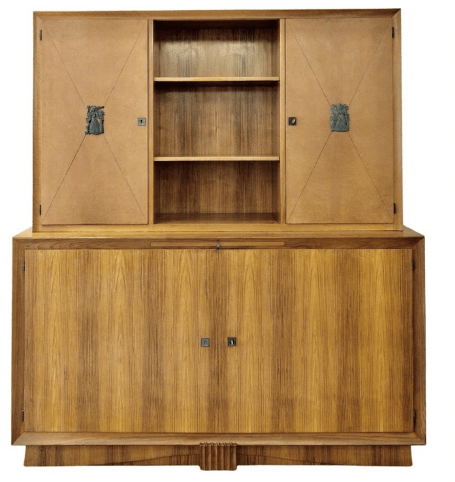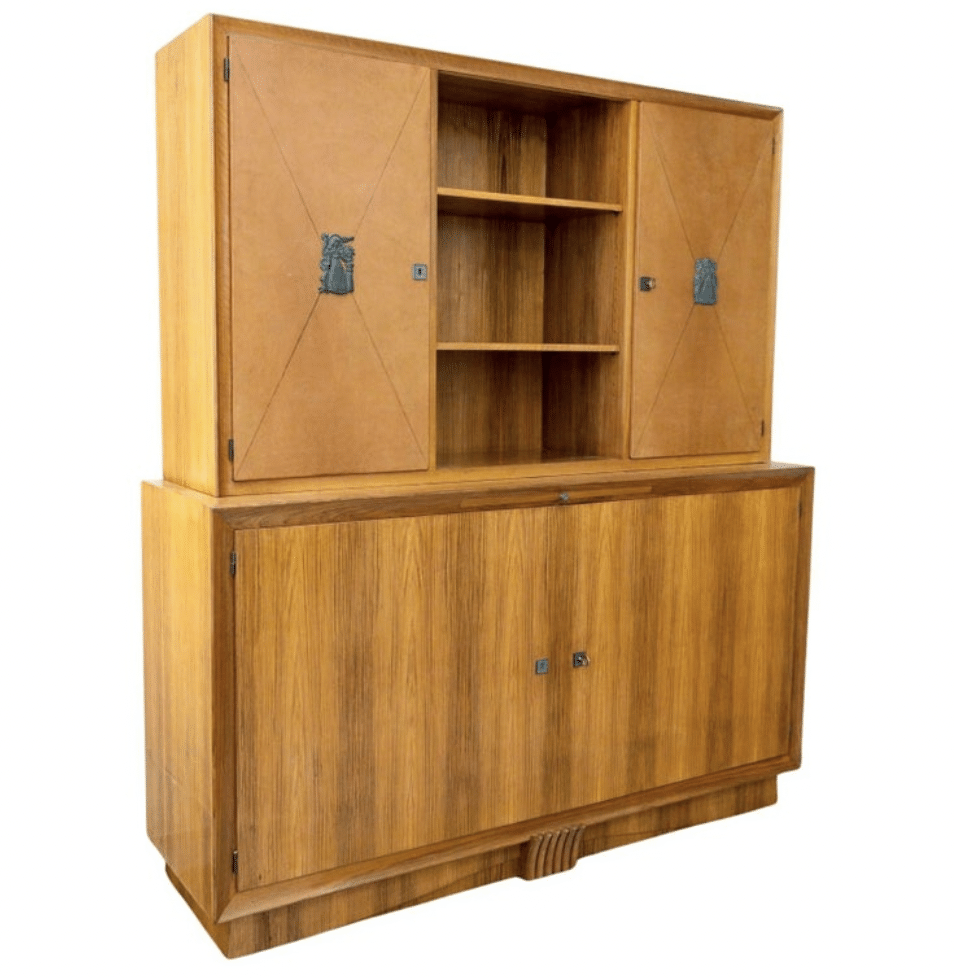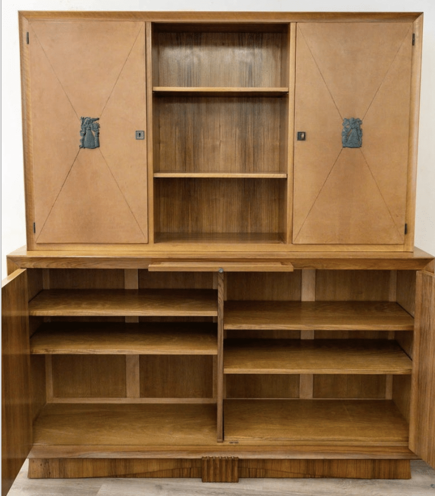 Dans la partie supérieure, deux panneaux de chaque côté de la façade sont recouverts de cuir d’origine couleur miel et décorés au centre de bronzes rustiques gris-vert de Léon Drivier (sculpteur, 1878-1951), tout comme les serrures.