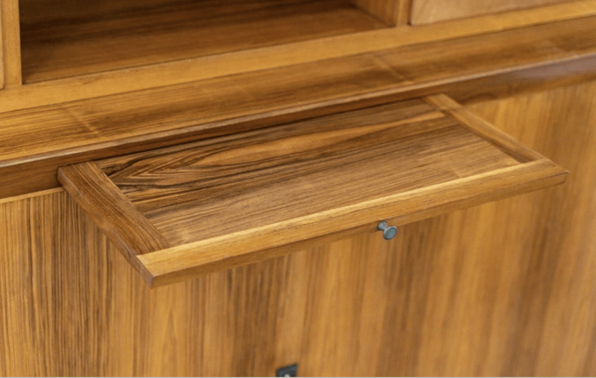 En haut, une étagère coulissante située au centre du dessus du meuble ajoute à son charme.