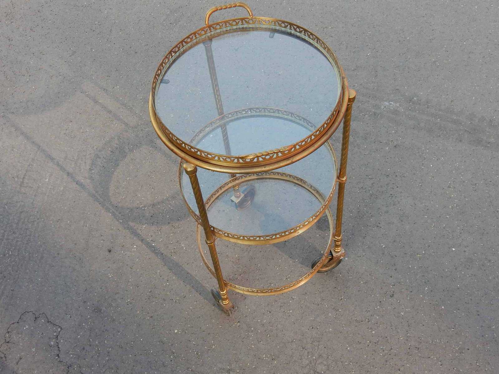 Desserte roulante ronde à trois plateaux avec galeries ajourées.