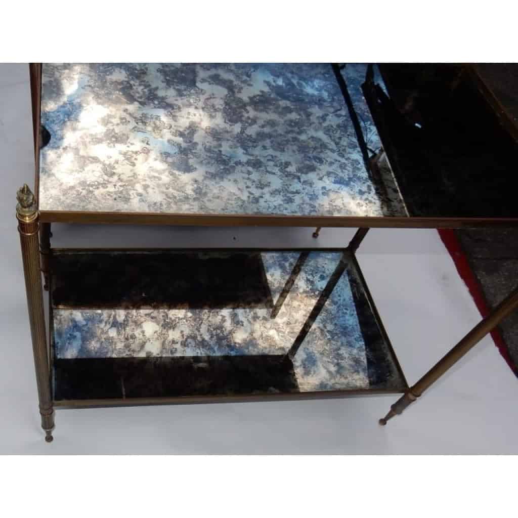Paire de tables d’appoint Rectangulaires en bronze et laiton avec plateaux miroirs oxydés vieillis, Maison Baguès, les montants se terminent en flammes olympiques vissées.