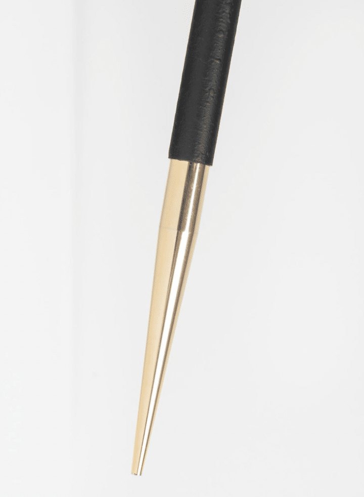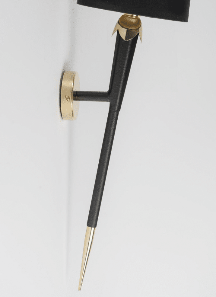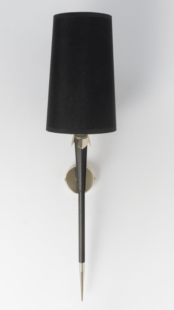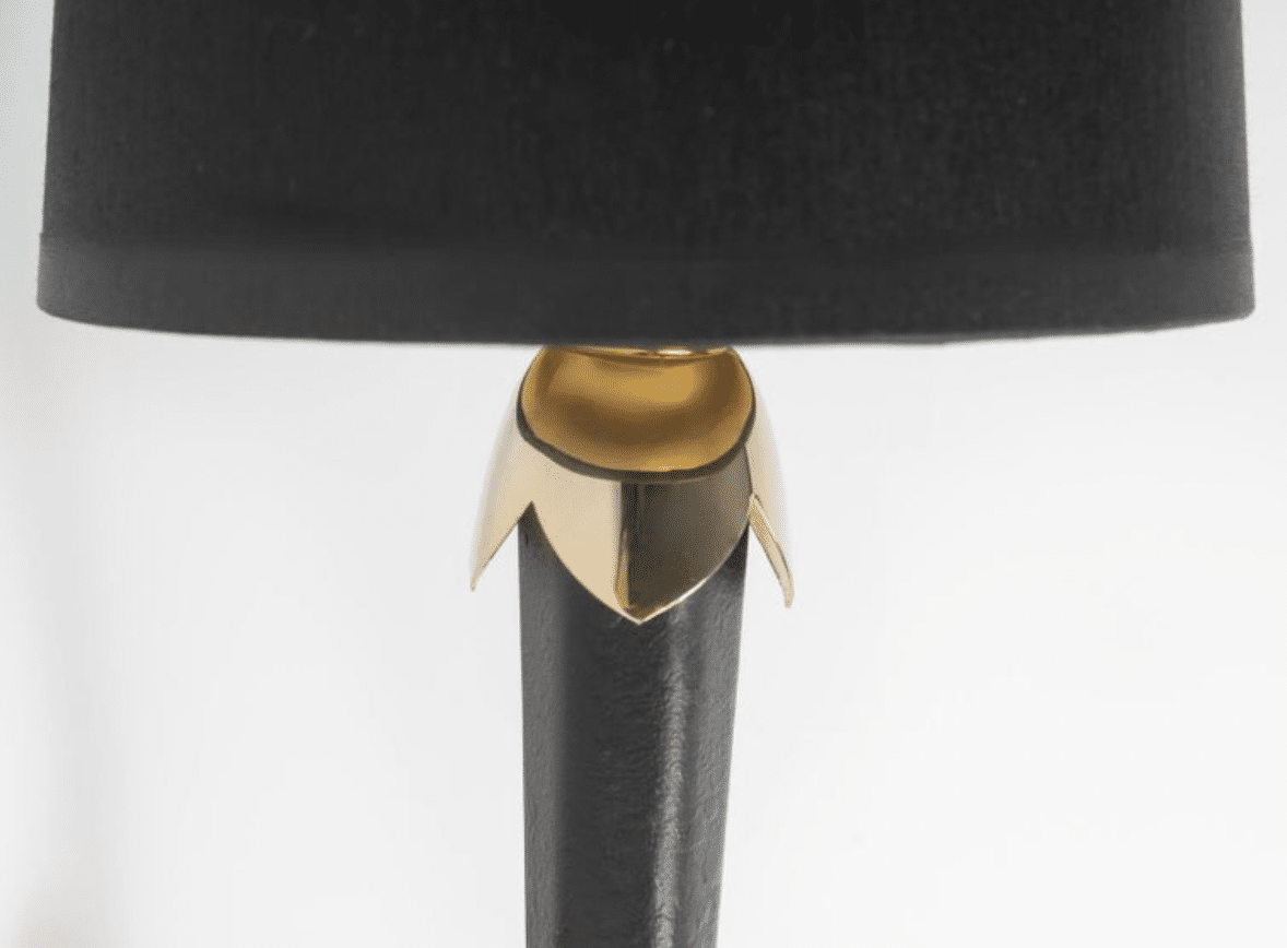 Le haut est orné d’une coupelle en laiton doré et équipé d’un abat-jour trapézoïdal en coton noir à l’extérieur et doré à l’intérieur.