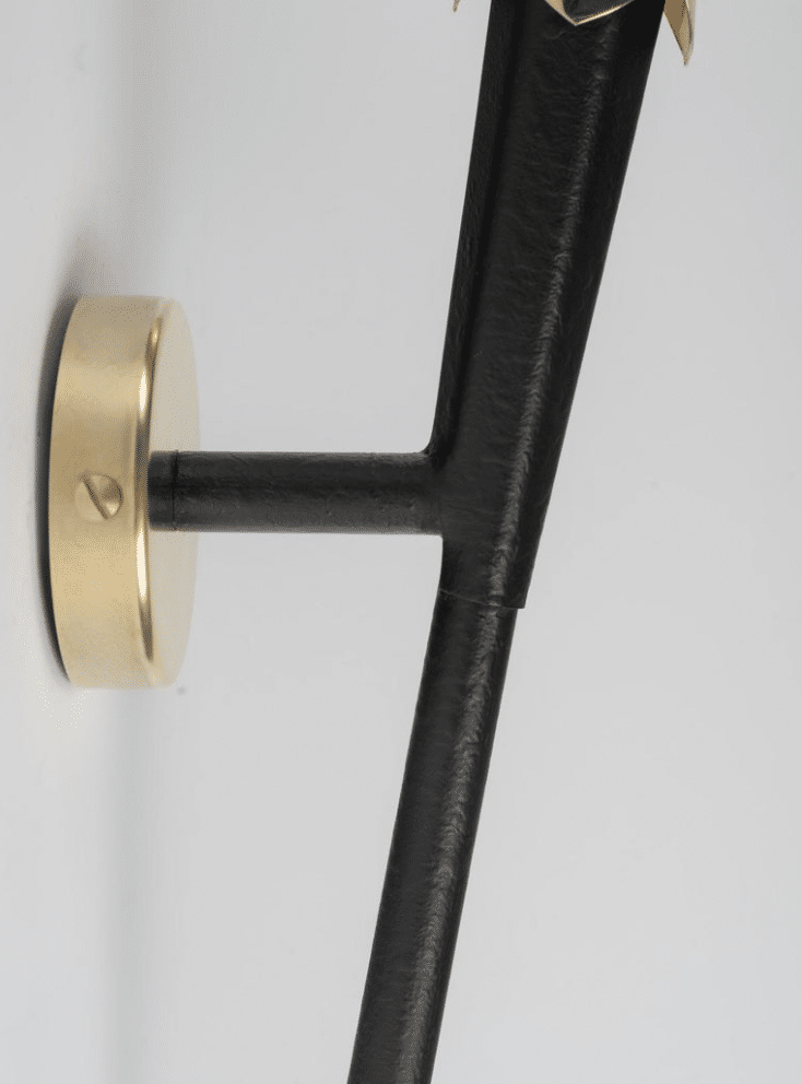 Composée d’un support mural rond en laiton doré soutenant un bras de lampe en fer forgé noir, décoré d’un embout en laiton doré dans sa partie inférieure.