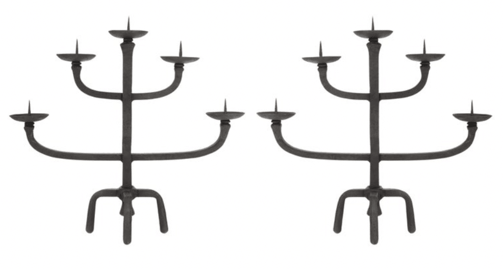Paire de chandeliers à cinq branches en fer forgé de Jean Touret de l’atelier Marolles, fabriqués à la main en France dans les années 1950.