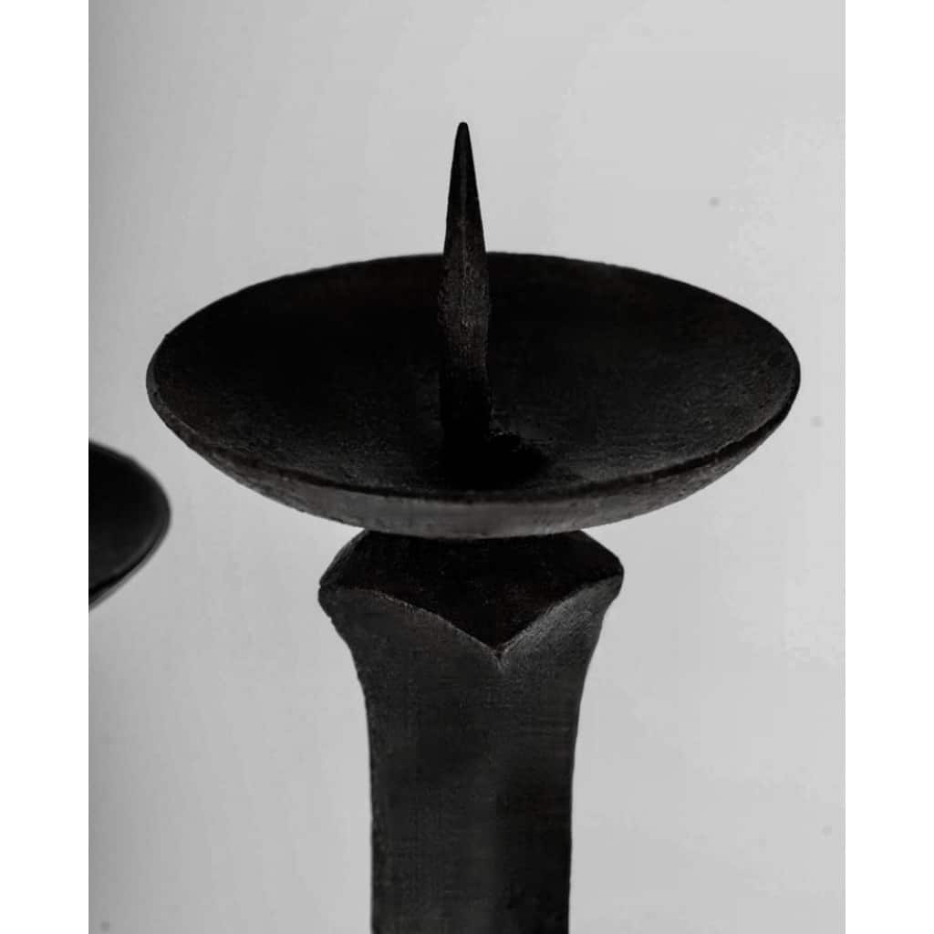 Les chandeliers reposent sur quatre pieds carrés qui s’évasent vers le bas. Au-dessus, la tige centrale carrée est décorée de deux sections qui se croisent, l’une au-dessus de l’autre, chacune supportant deux chandeliers de part et d’autre de la tige centrale, placés à des hauteurs différentes.