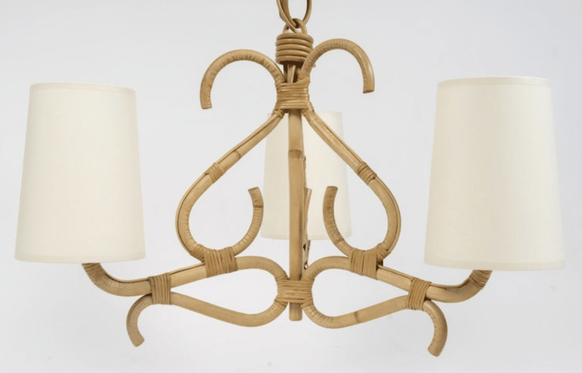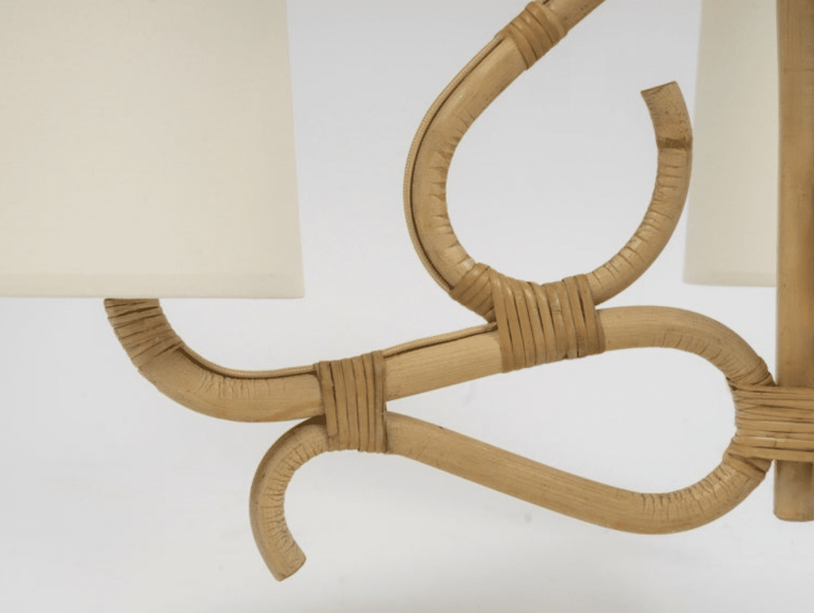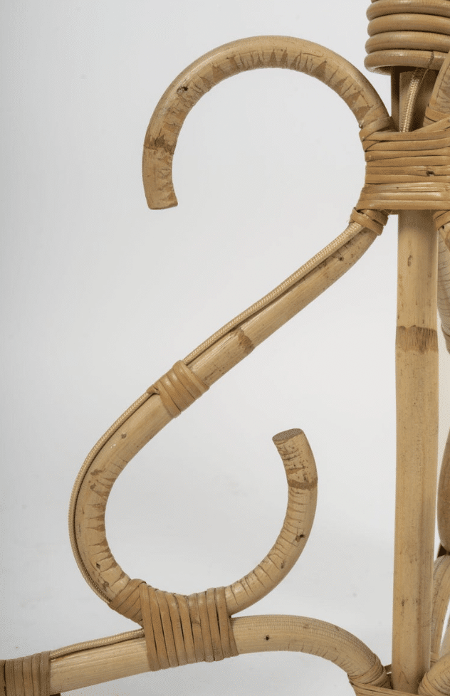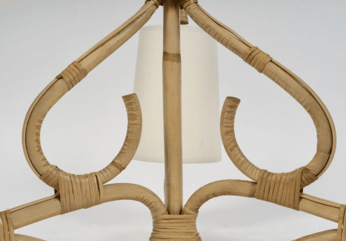 Dans la partie inférieure, trois tiges de bambou courbées forment les bras du luminaire. Leurs extrémités sont recouvertes de trois abat-jours trapézoïdaux en coton blanc cassé, qui ont été refaits à l’identique des originaux.