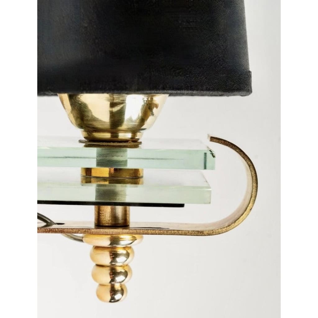 Sur la partie coudée repose le bras de lumière, il est décoré de deux petites plaques de verre biseautées placées entre de petits cylindres en laiton doré traversant les verres, la base puis une plaque de laiton doré placée sous le coude partant de l’arrière de la plaque murale et suivant la forme du bras remontant sur le devant de l’applique en formant une demi-boucle.