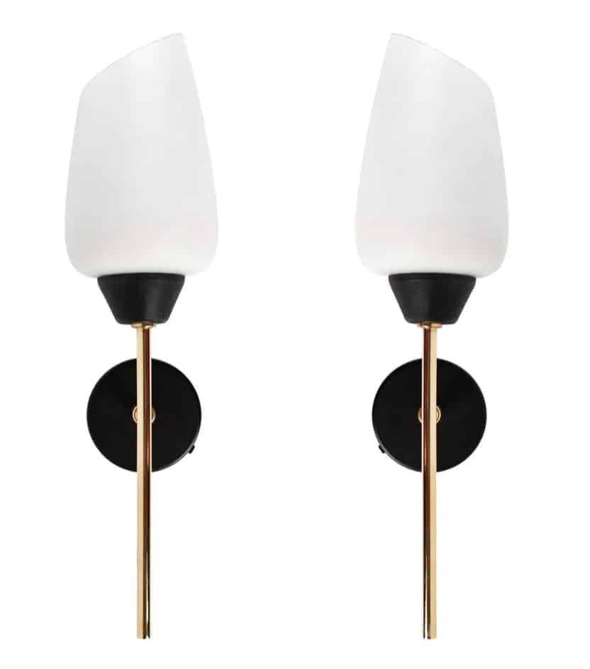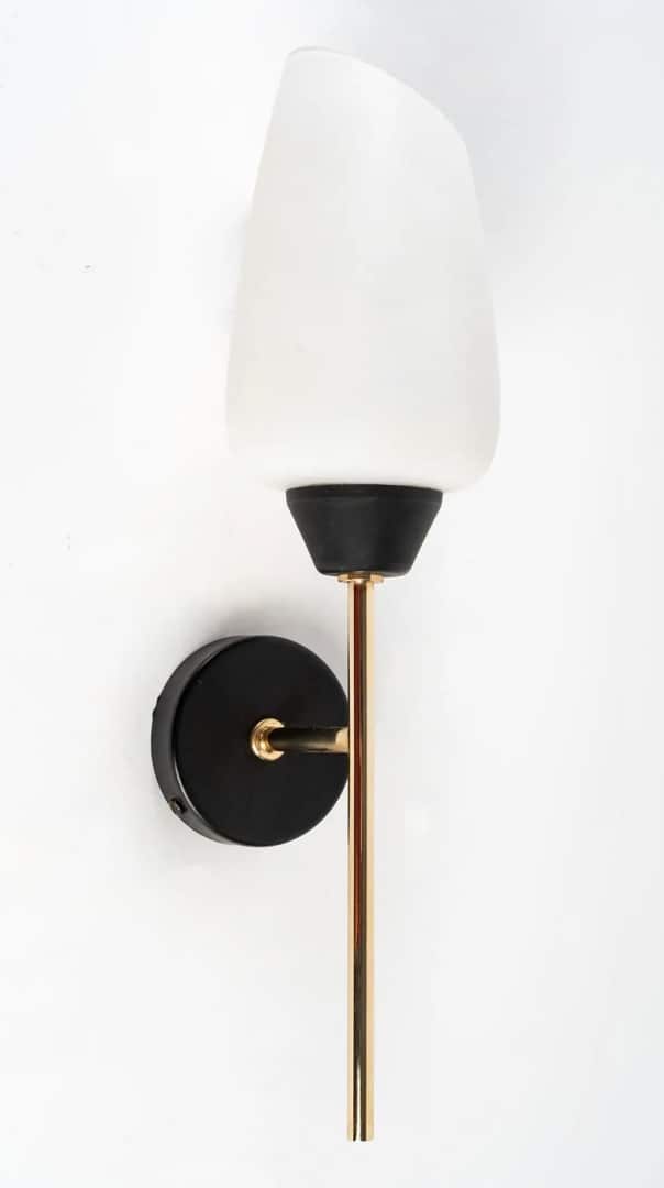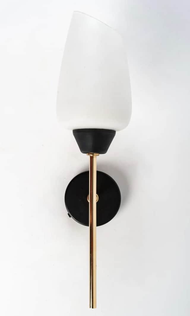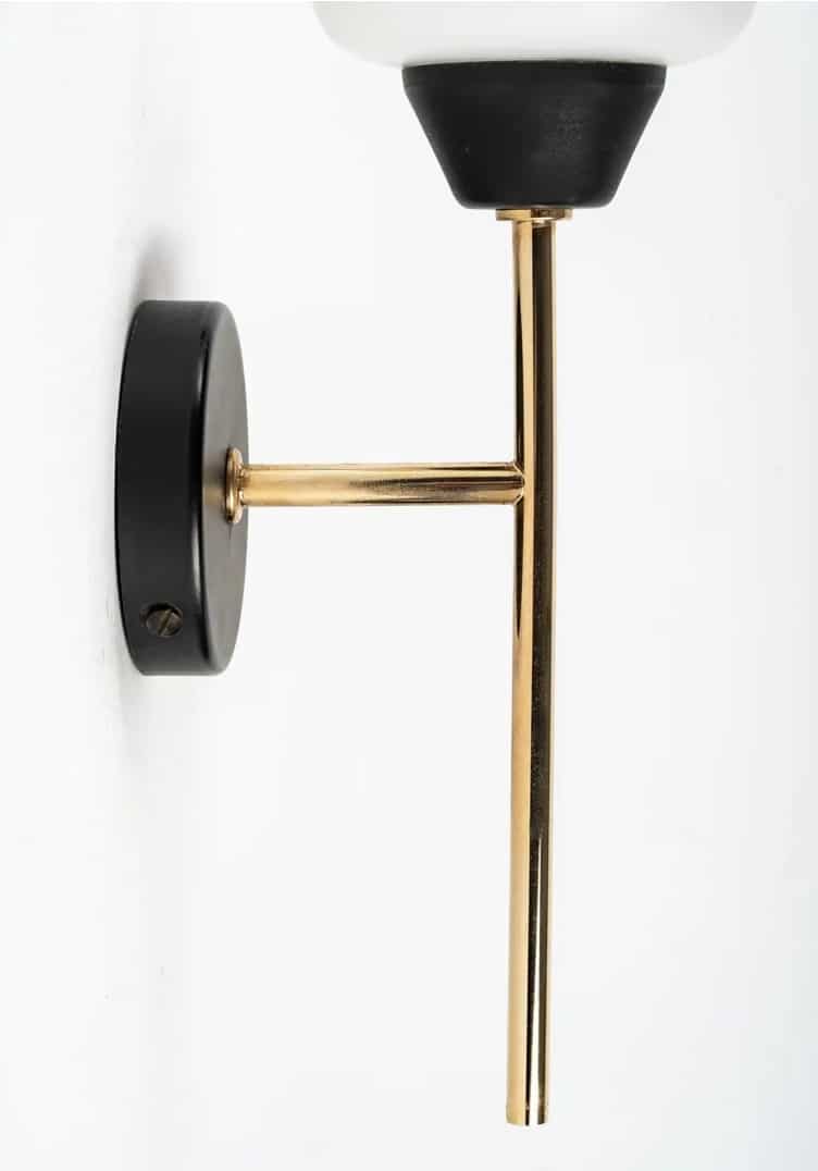 Composée d’un support mural de forme ronde en laiton noirci supportant une tige de section ronde en laiton doré habillée sur la partie haute d’une opaline originale à bord