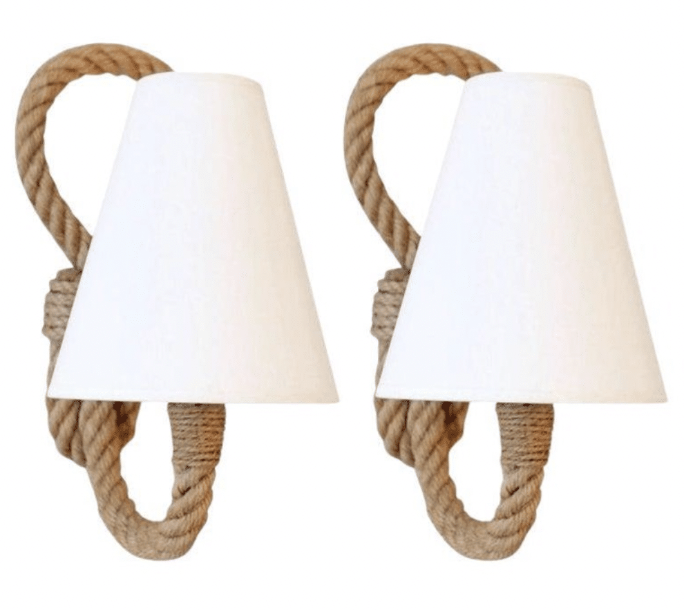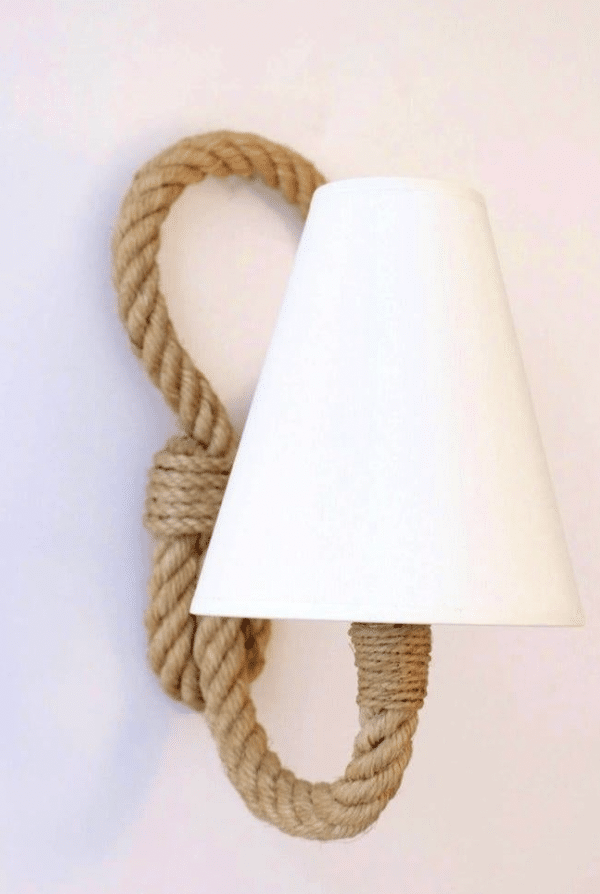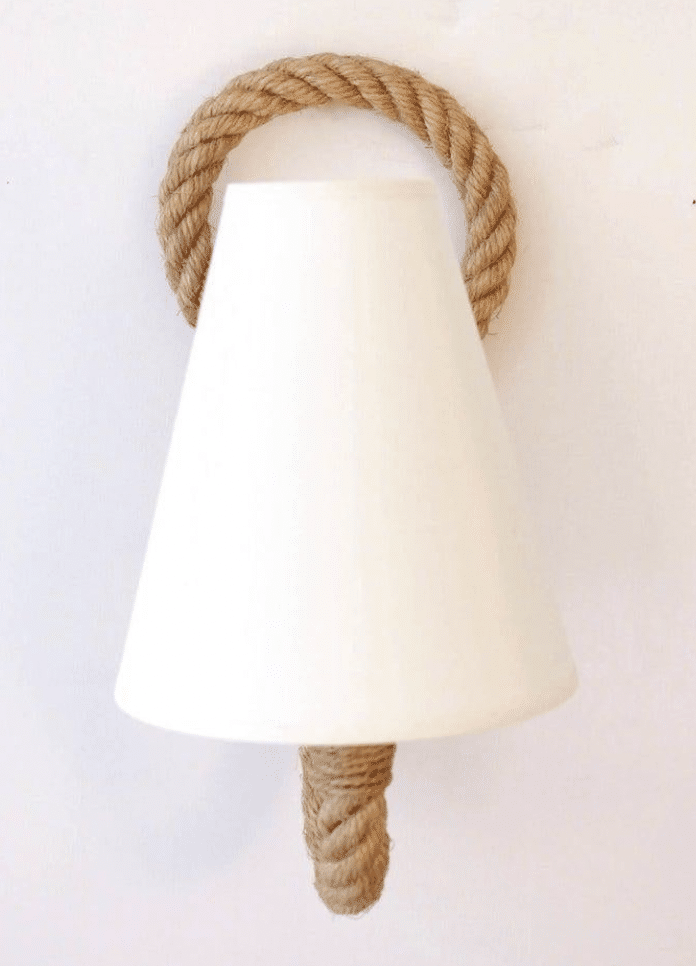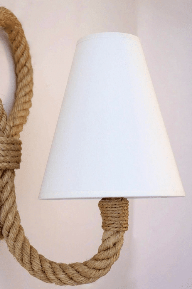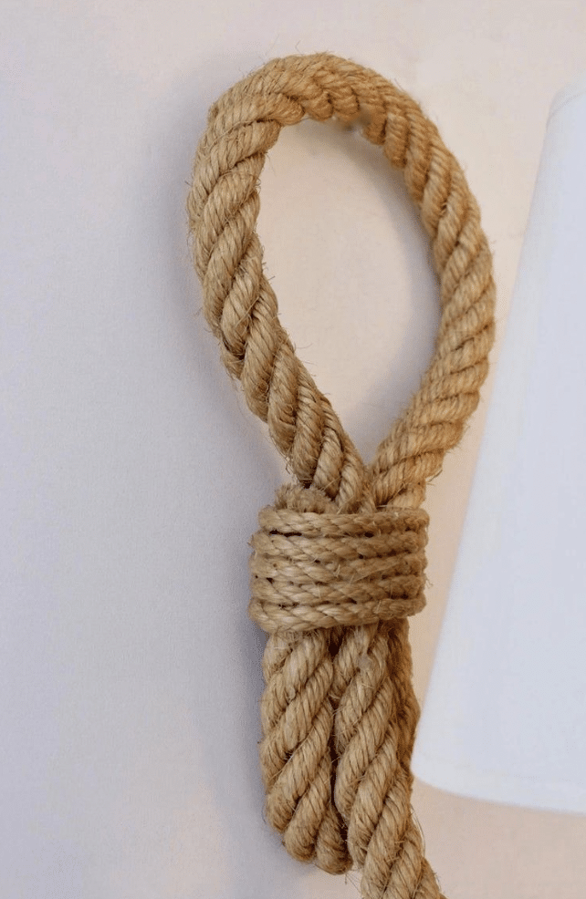 Chaque applique est composée d’une tige de corde formant une boucle sur la partie supérieure permettant la suspension murale puis le bras descend pour former le bras de lumière.
