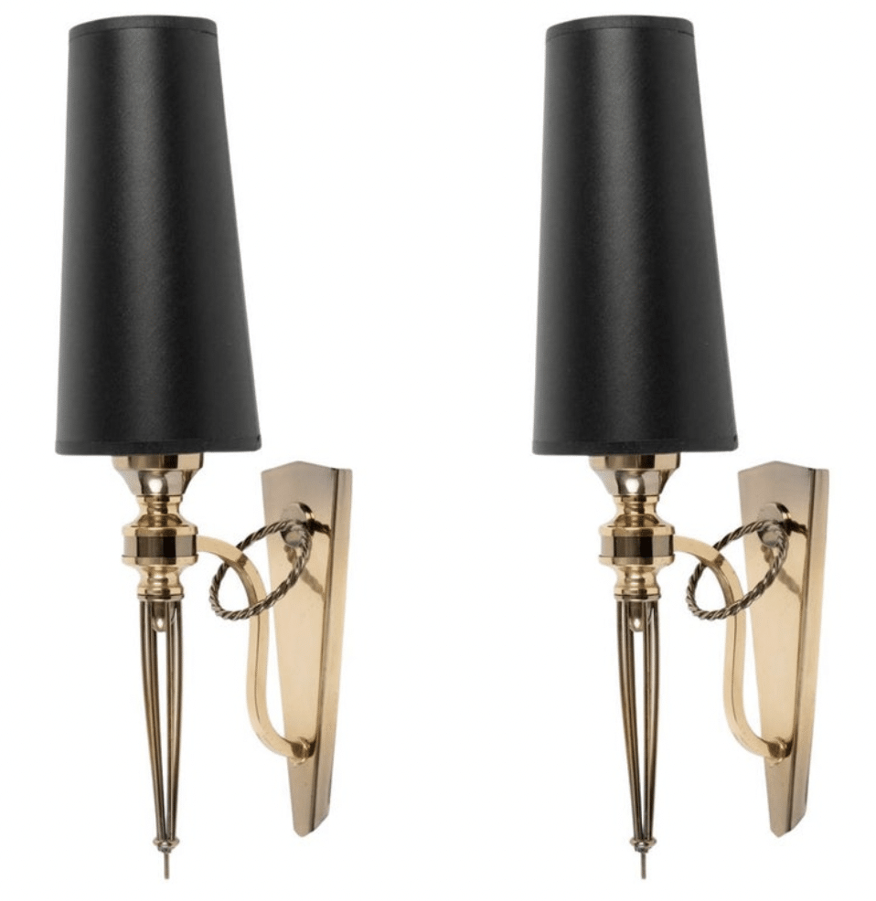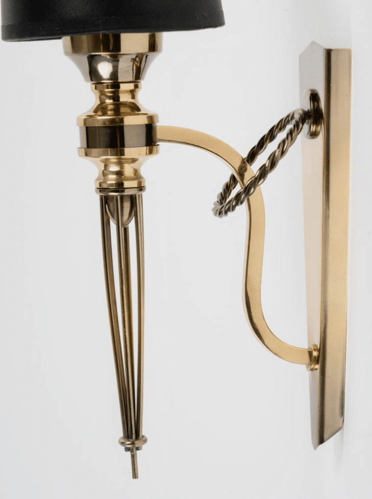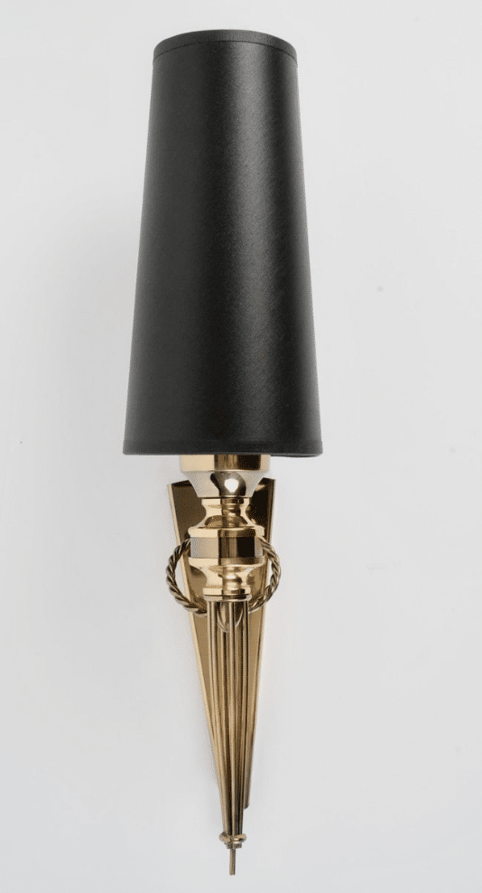 En haut, un abat-jour trapézoïdal en coton noir avec un intérieur doré orne l’applique murale, souligné par une coupelle cylindrique en laiton doré.