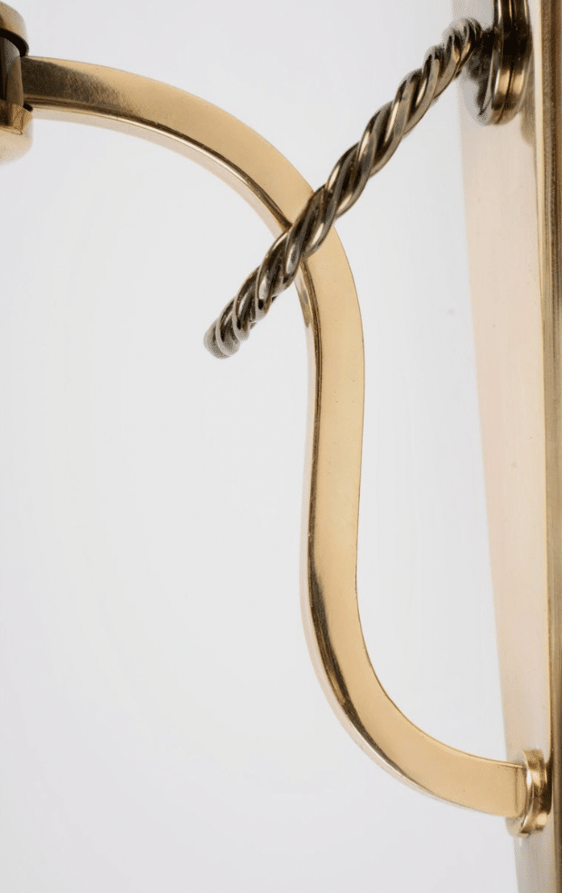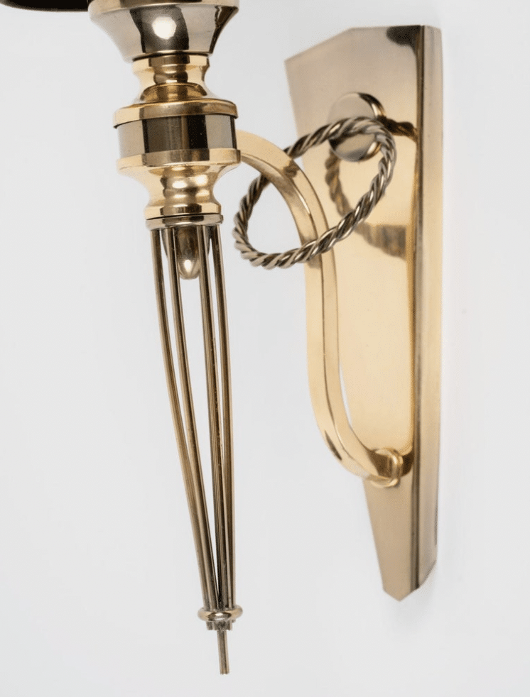 Dans sa partie inférieure, le bras de lumière forme une tige ajourée composée de fines tiges en laiton doré décorées à l’intérieur de la partie supérieure d’une demi-sphère allongée et assemblées dans la partie inférieure par un petit anneau souligné par une fine pointe, le tout en laiton doré.