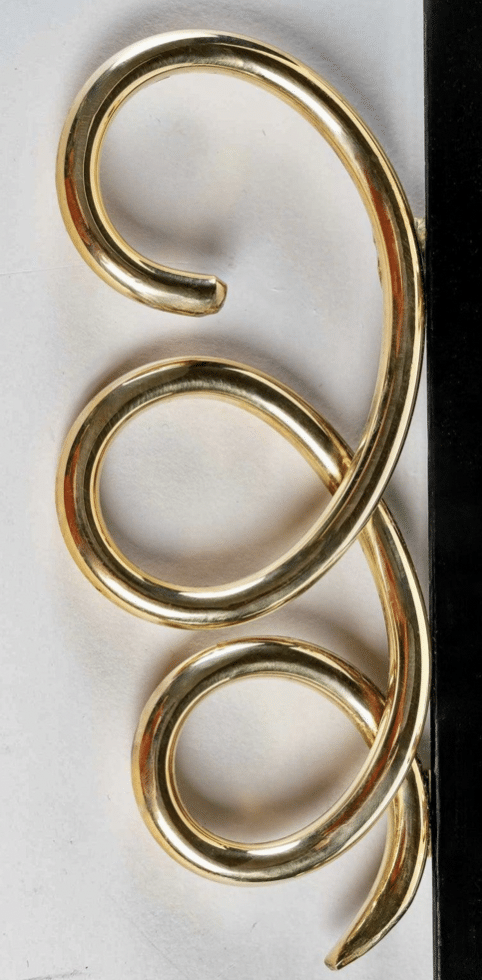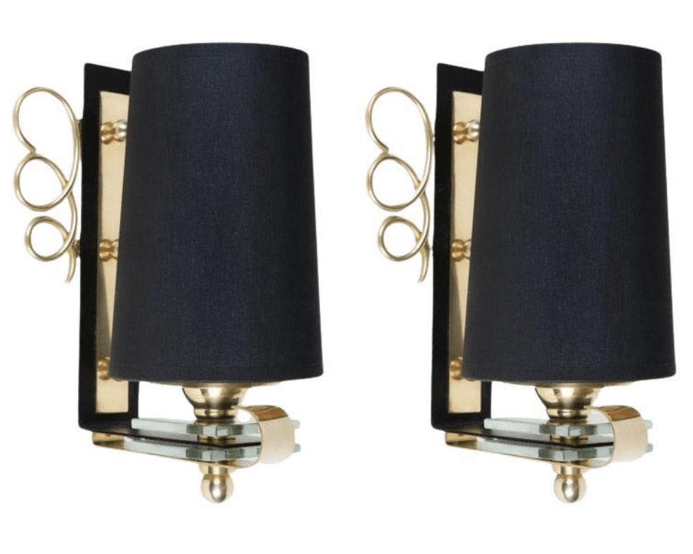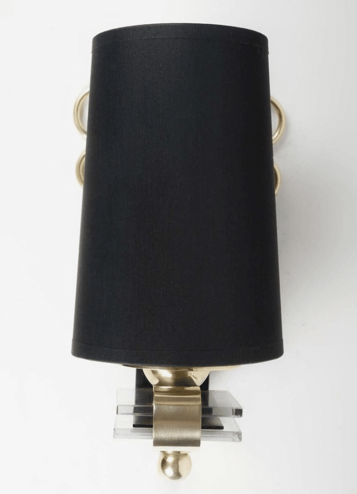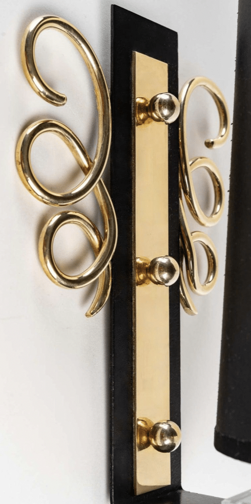 Composée d’une plaque murale incurvée dans sa partie inférieure en laque satinée noire, elle est rehaussée sur la partie murale par de fines boucles en laiton doré placées de chaque côté de l’applique et décorée en son centre d’une plaque en laiton doré maintenue par 3 petits boutons en laiton doré.