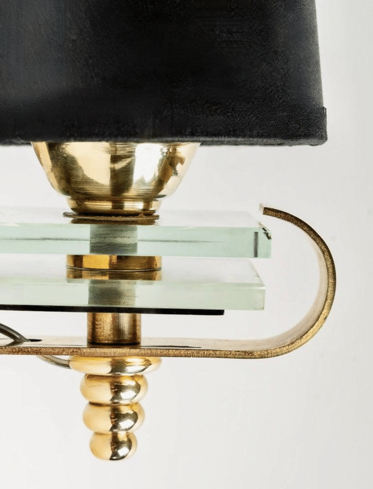 Sur la partie courbée repose le bras de la lampe, décoré de deux petites plaques de verre biseautées placées entre de petits cylindres en laiton doré qui traversent les verres, la base étant ensuite une plaque en laiton doré placée sous la courbure à partir de l’arrière de la plaque murale et suivant la forme du bras qui remonte sur le devant de l’applique en formant une demi-boucle.