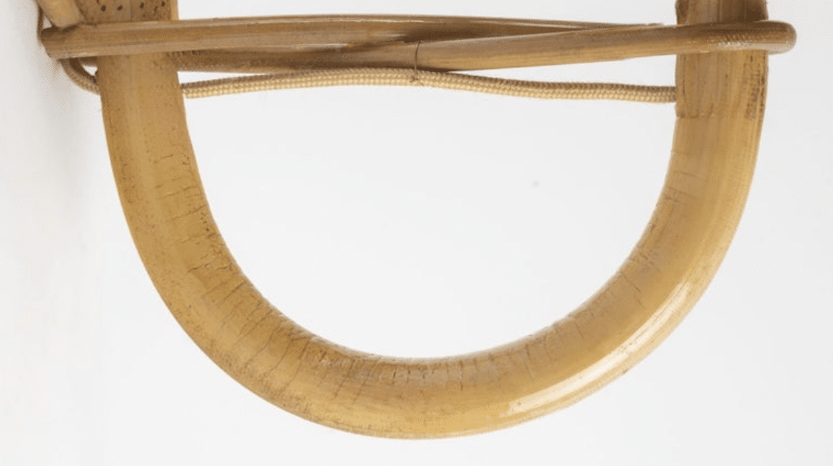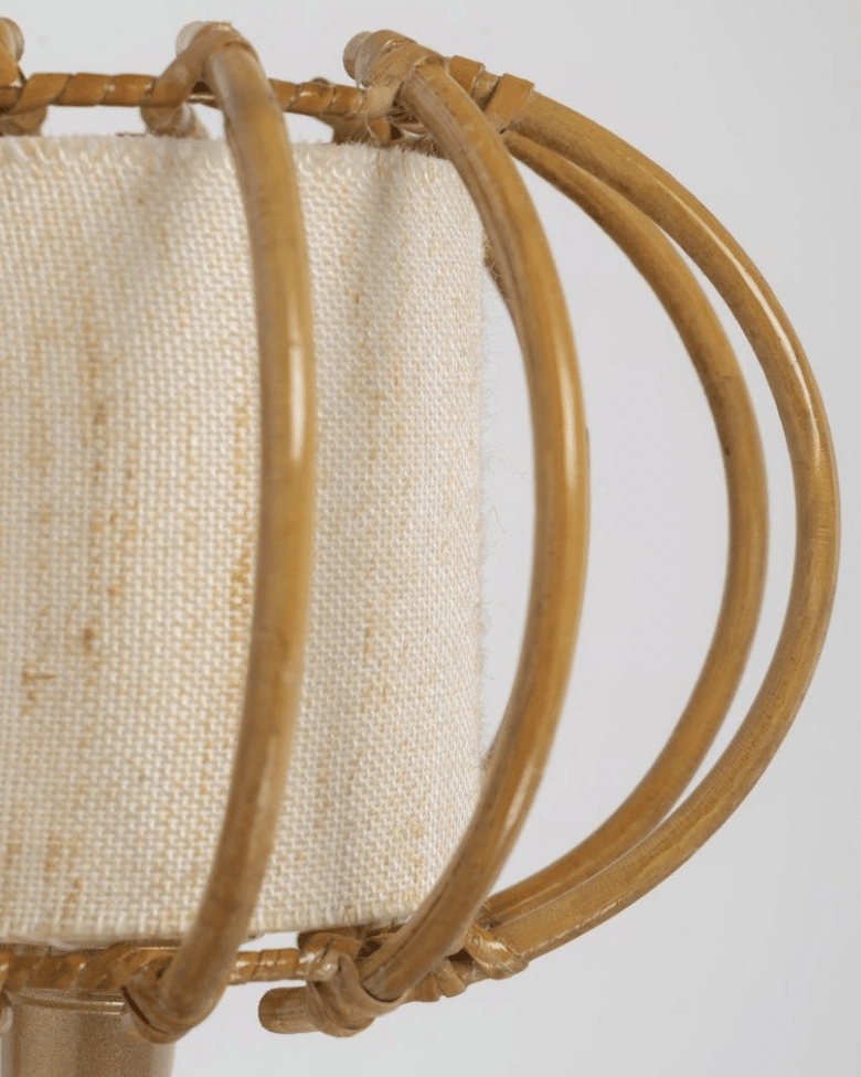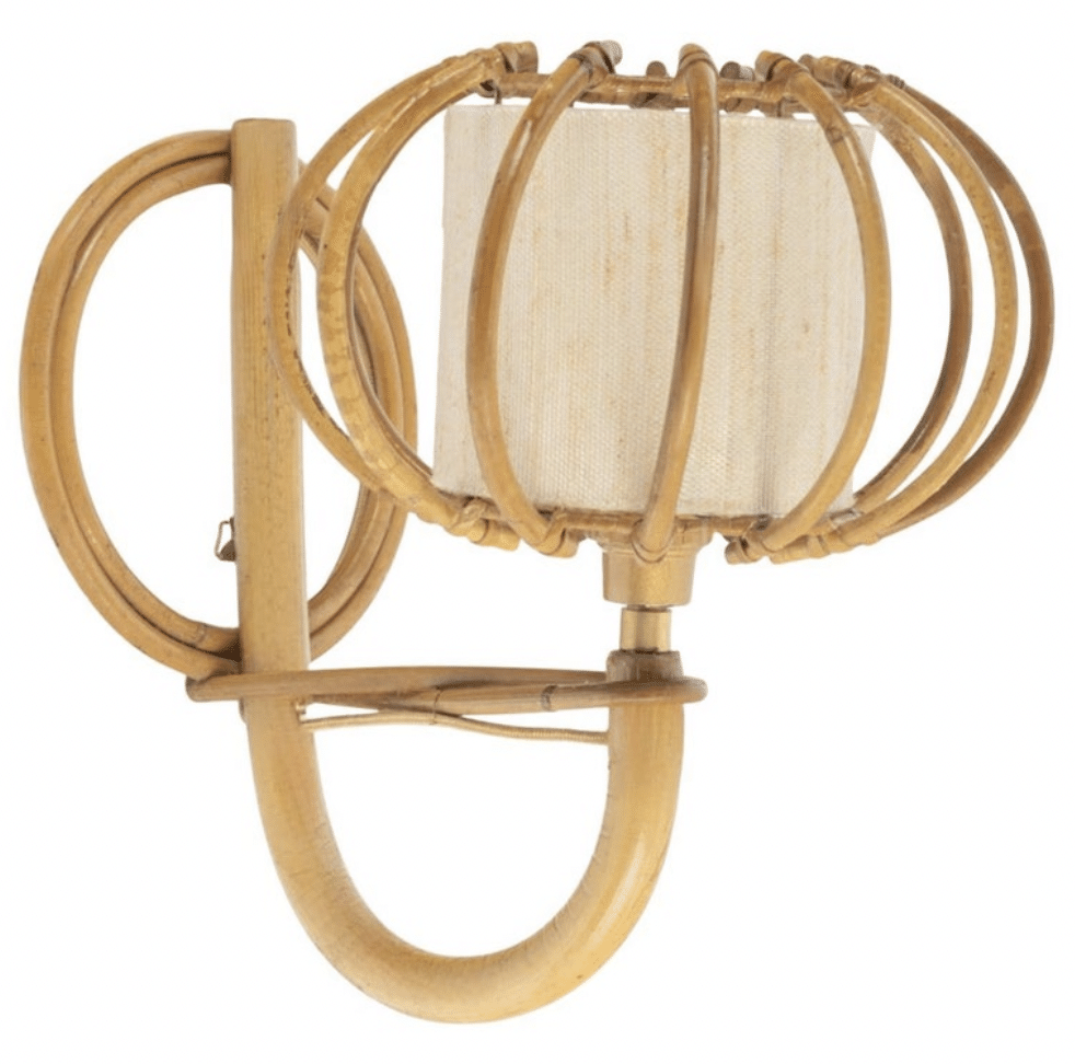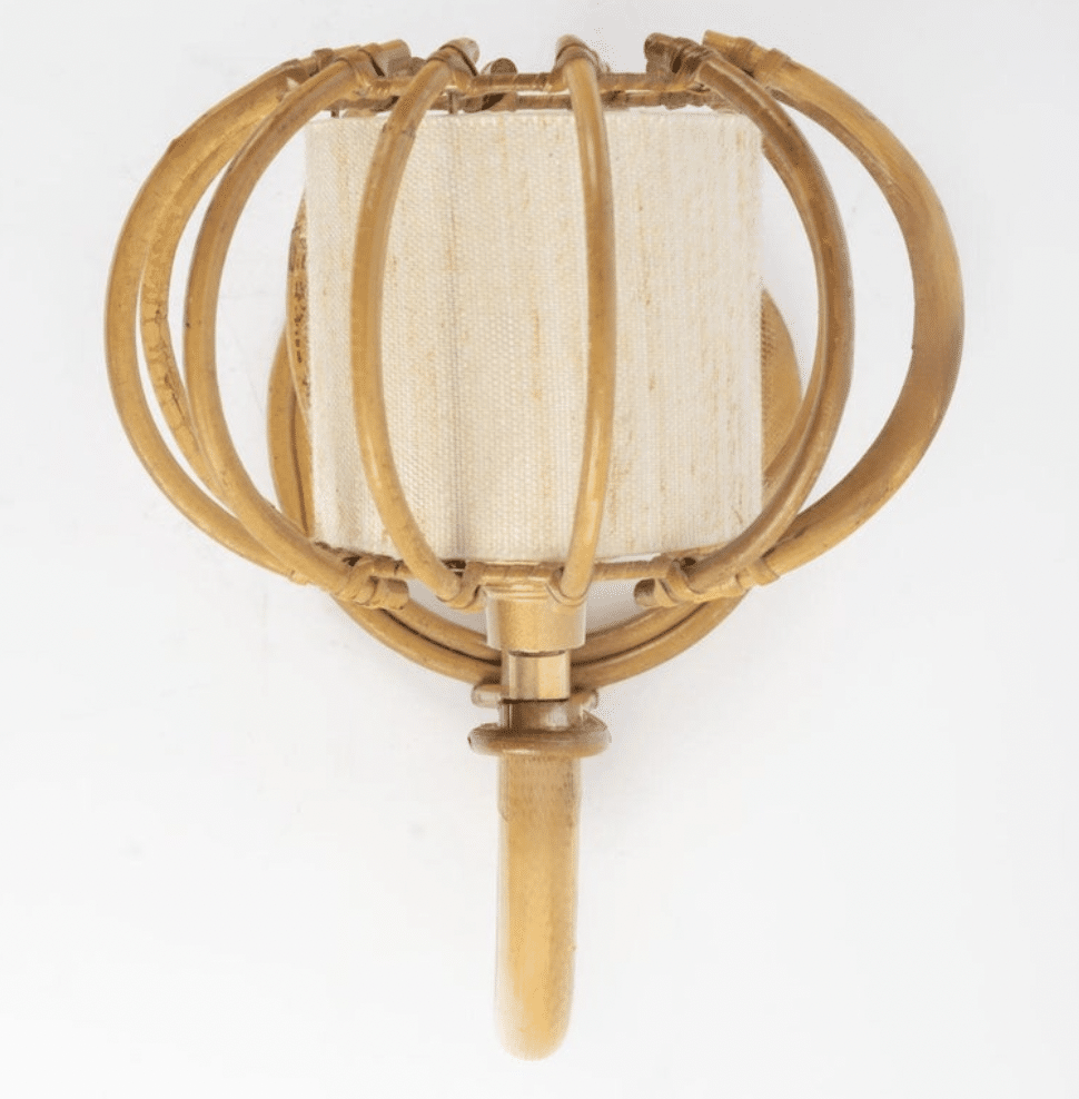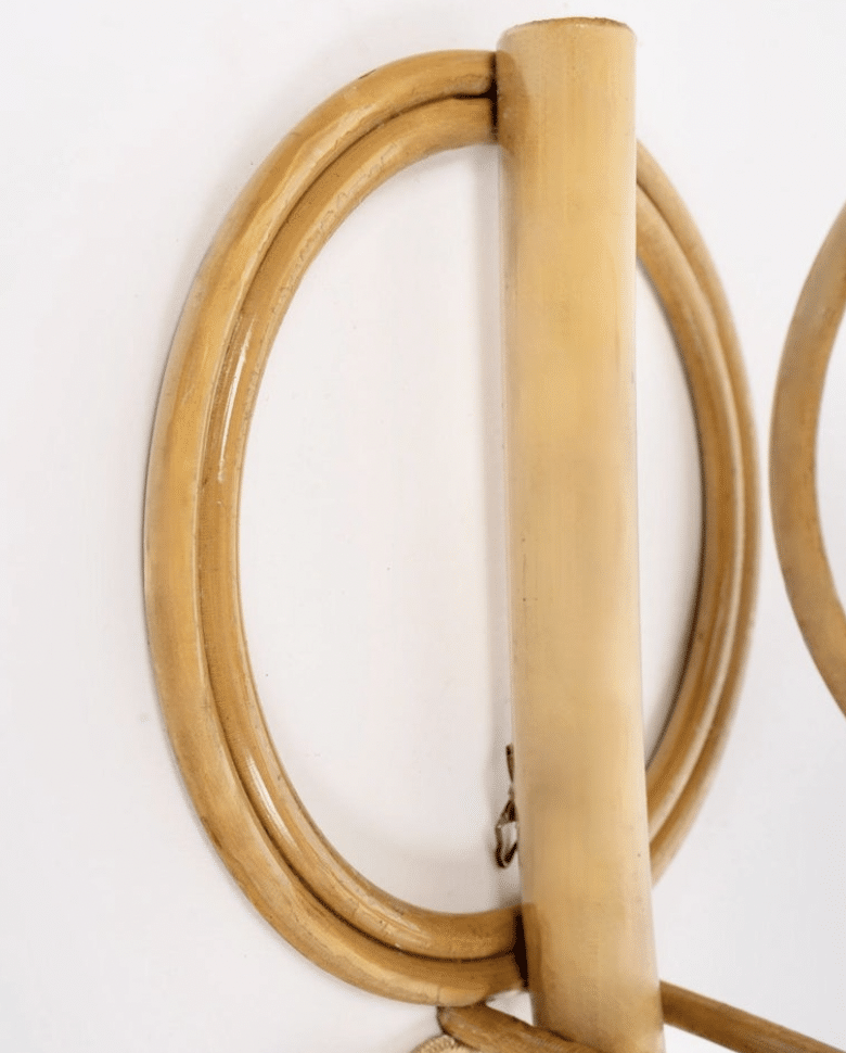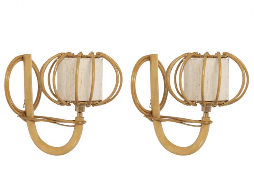Composées d’un support mural arrondi soutenant une tige centrale sur laquelle repose le bras lumineux recouvert d’un abat-jour formé de tiges arrondies placées verticalement. L’intérieur est doublé d’un abat-jour en coton d’origine avec un motif tissé.