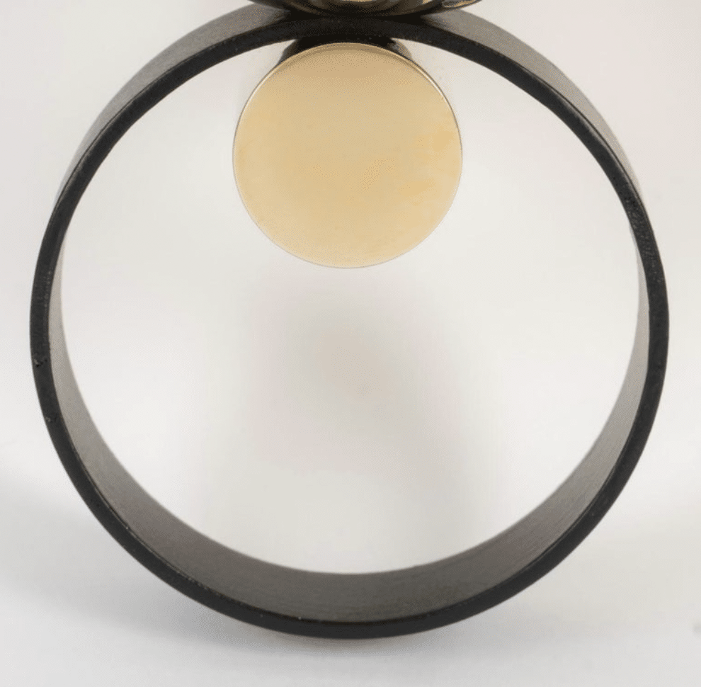 Composées d’un support mural noir orné d’une plaque en laiton doré soutenant deux petits bras lumineux orientés vers le haut, décorés de coupelles en laiton doré et rehaussés dans leur partie inférieure par des anneaux en laiton noirci.