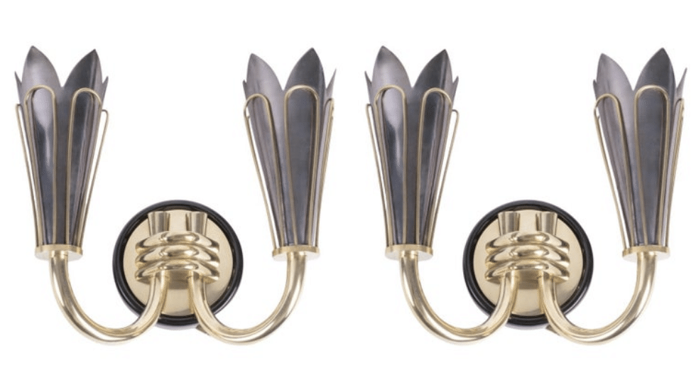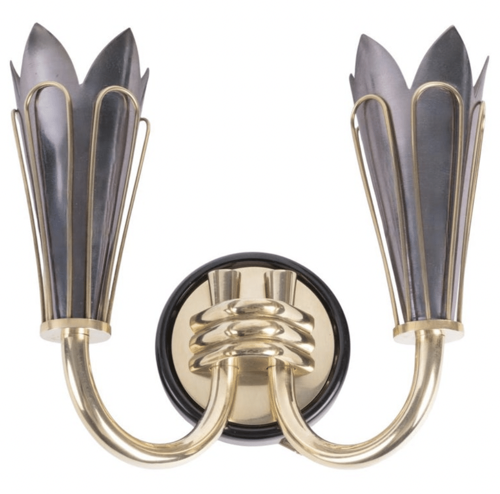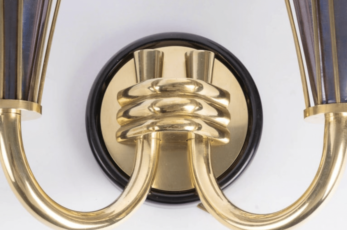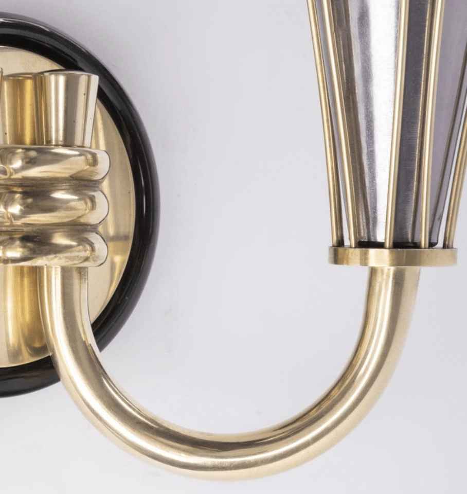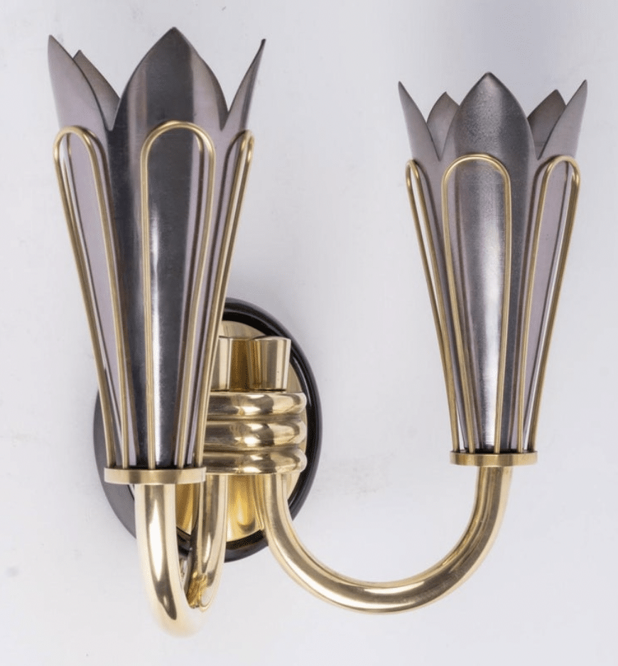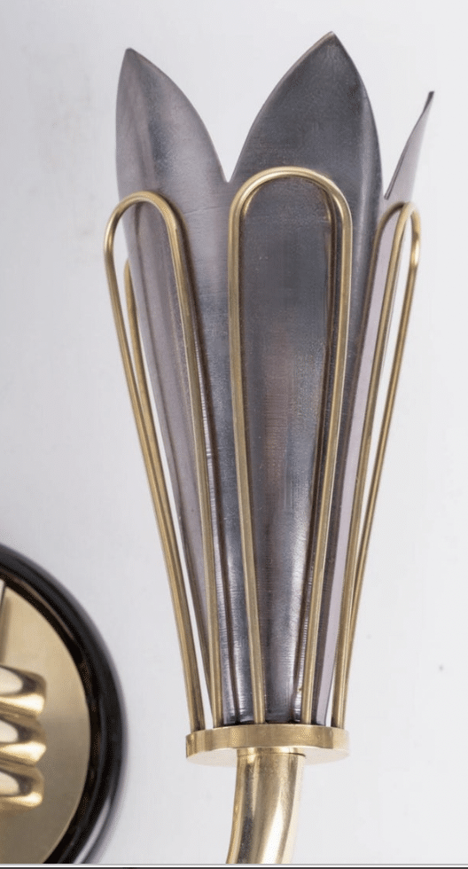 Composées d’un support mural rond en laiton noirci surmonté d’un cercle plus petit en laiton doré, soutenant deux bras lumineux orientés vers le haut maintenus en place à la base par trois petites tiges en bronze doré.