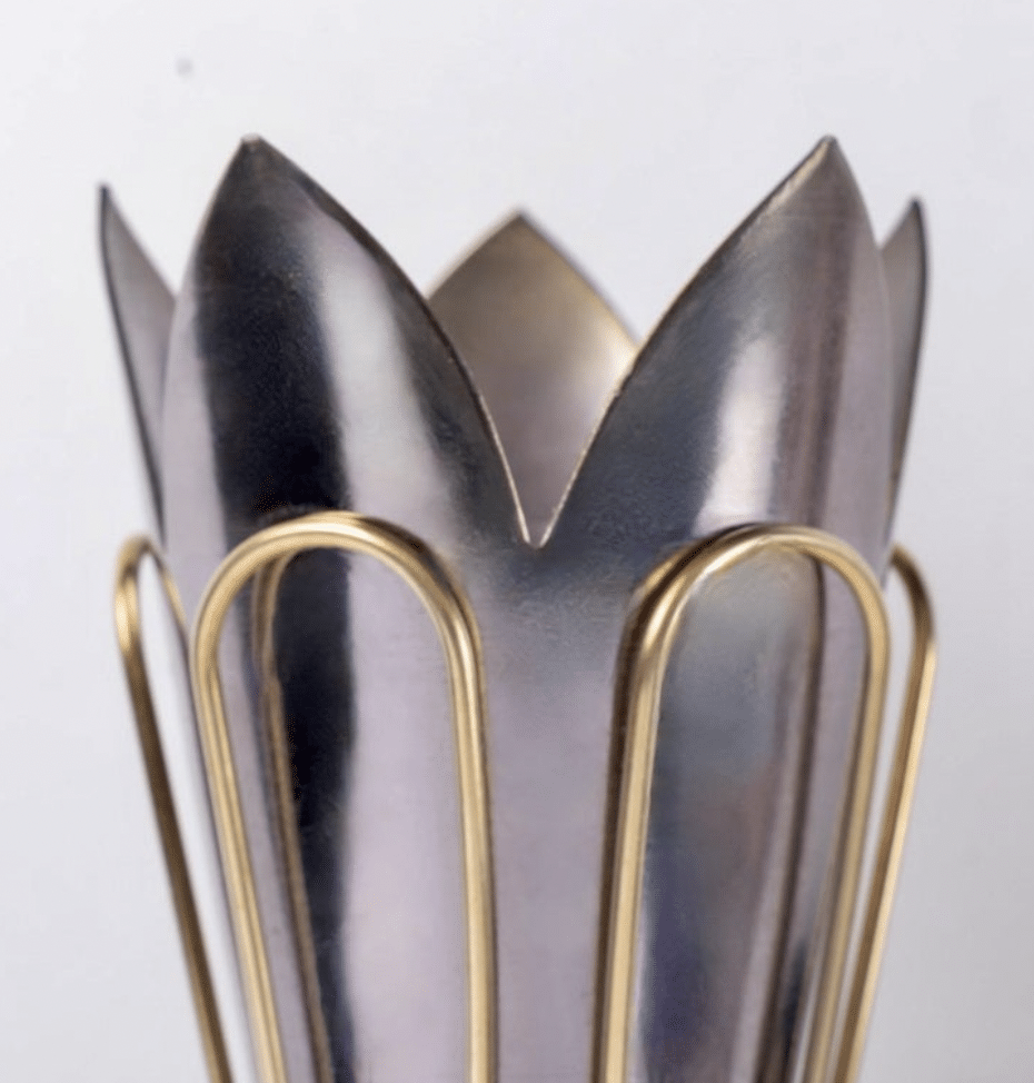 Au sommet des bras se trouvent des cônes dentelés en laiton patiné bronze, décorés sur le pourtour de fines bandes de laiton doré.