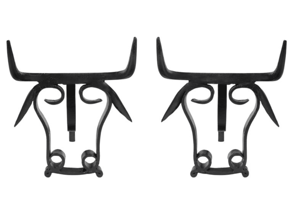 Paire de chenets en fer forgé en forme de tête de taureau.