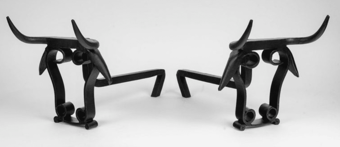 1950 Paire rare de chenets en fer forgé en forme de tête de taureau, ateliers de Vallauris