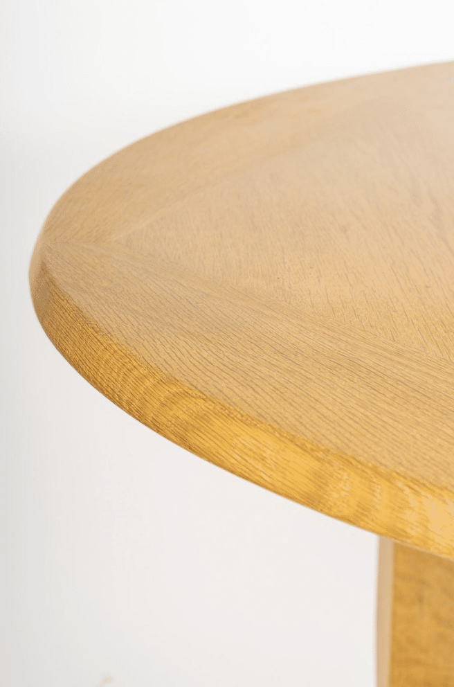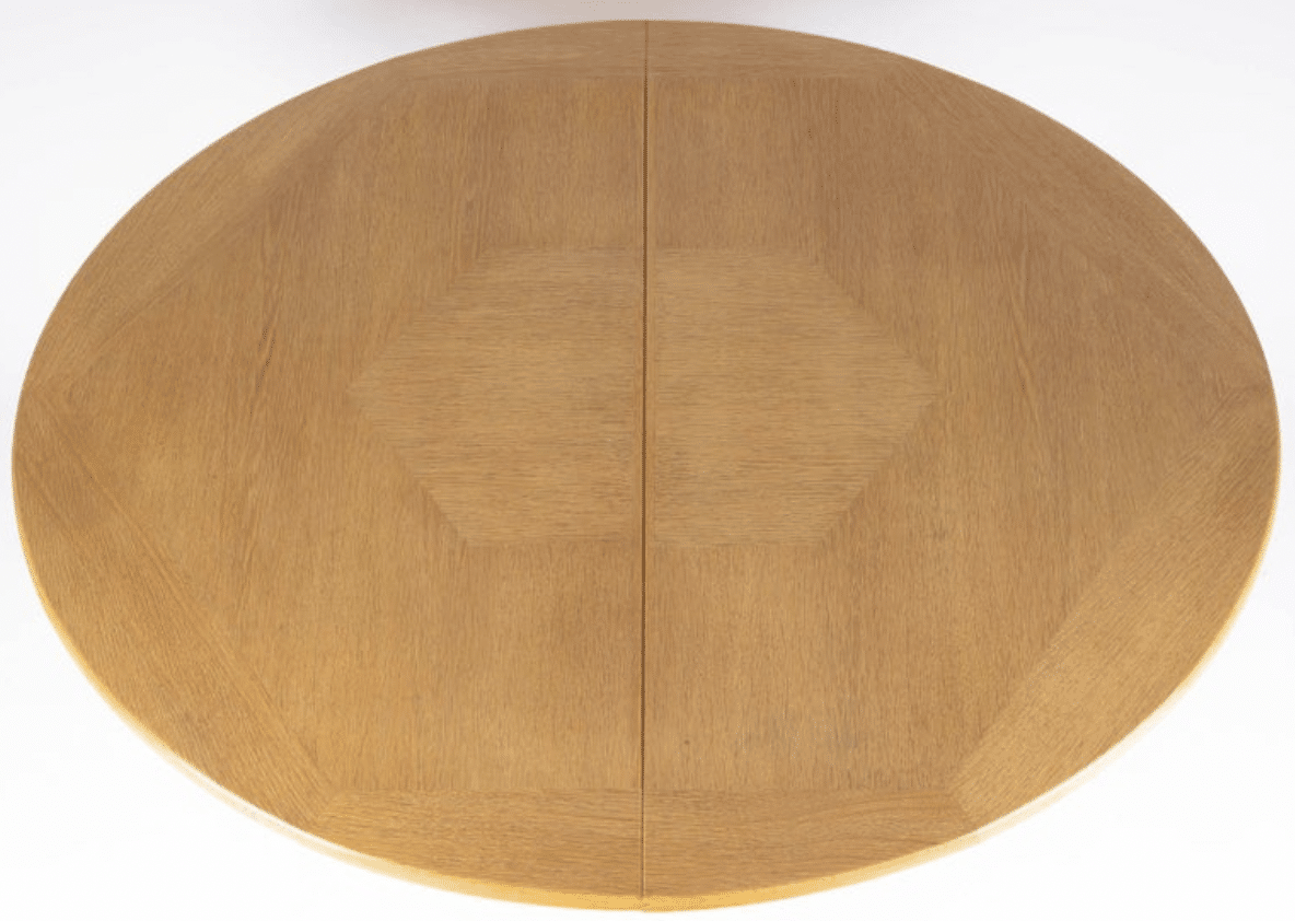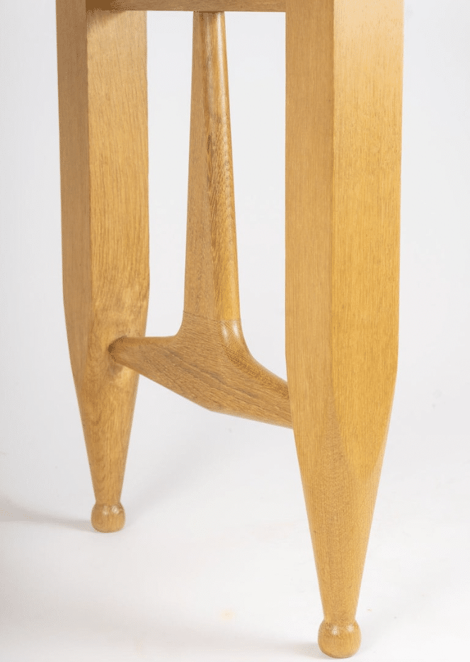 Composée d’un plateau en chêne blond massif assemblé selon un motif géométrique, reposant sur 4 pieds avec traverses se terminant par des pieds boules.