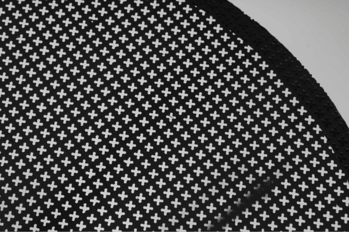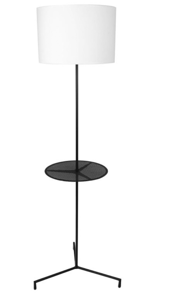 Au sommet de la tige centrale, un abat-jour cylindrique en coton blanc cassé, assorti à l’original, orne le lampadaire.