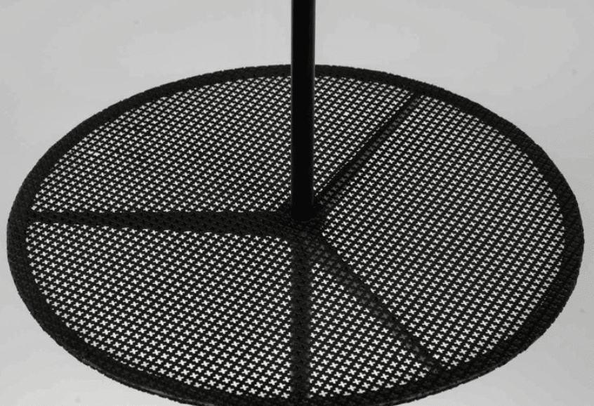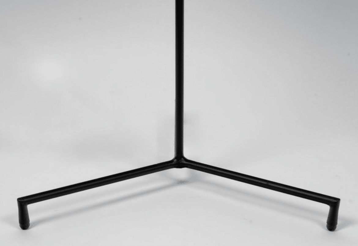 À mi-hauteur de la tige centrale se trouve une étagère circulaire en fer perforé qui sert de table d’appoint.