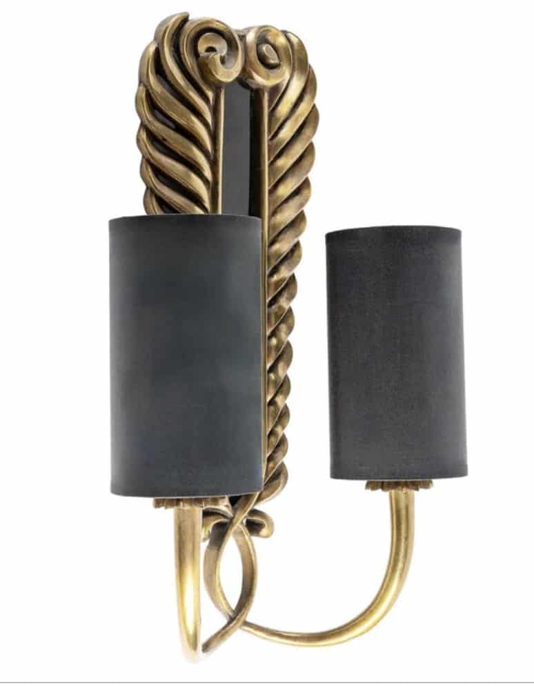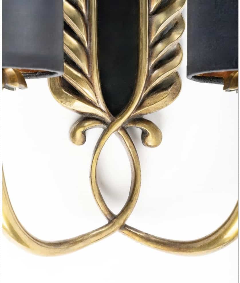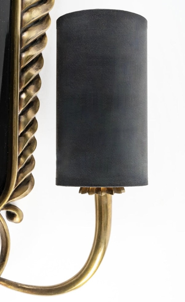 Dans la continuité sur la partie basse, deux bras de lumière remontant répartie de chaque côté de l’applique sont habillé d’abats jour en coton noir de forme cylindrique refait à l’identique et décoré à la base de chaque bras de lumière d’une corolle, le tout en bronze doré.