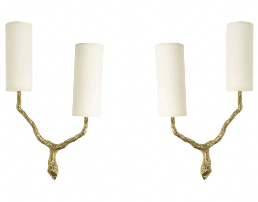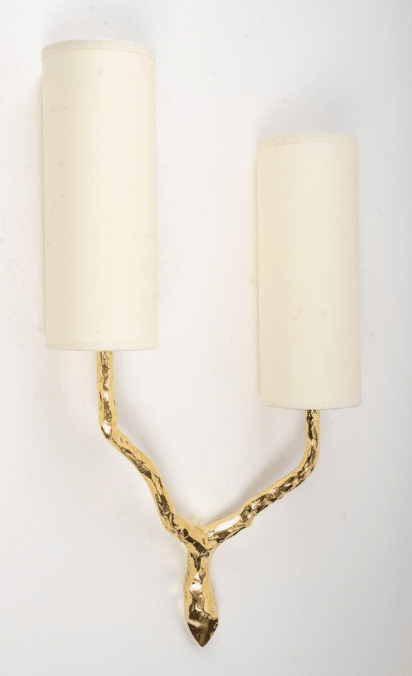 Composées d’une tige centrale inspirée d’une branche d’arbre, s’évasant et se séparant au sommet pour former deux branches lumineuses en bronze doré. Les deux bras lumineux en bronze doré.