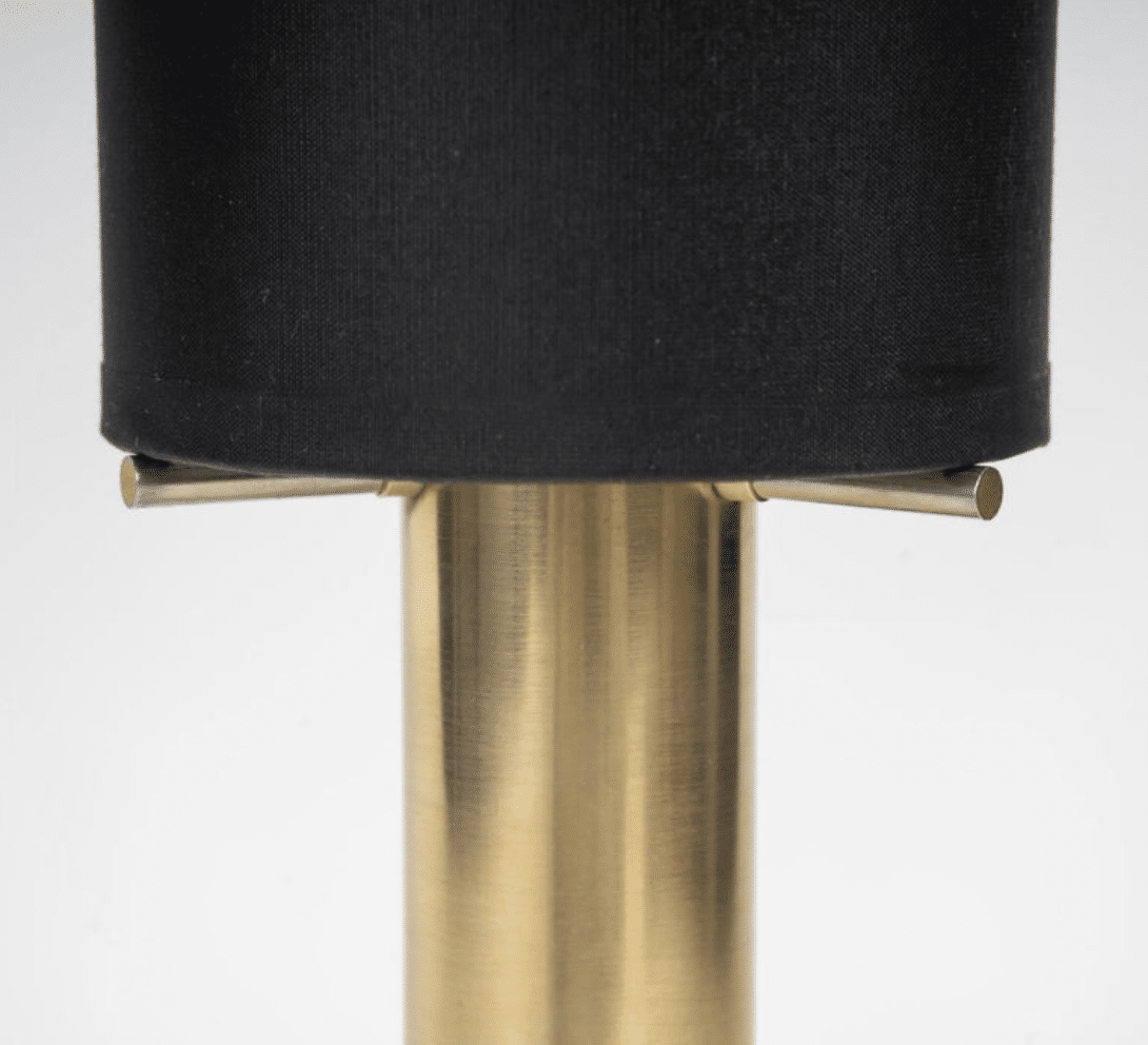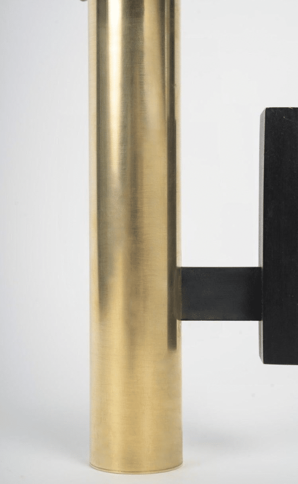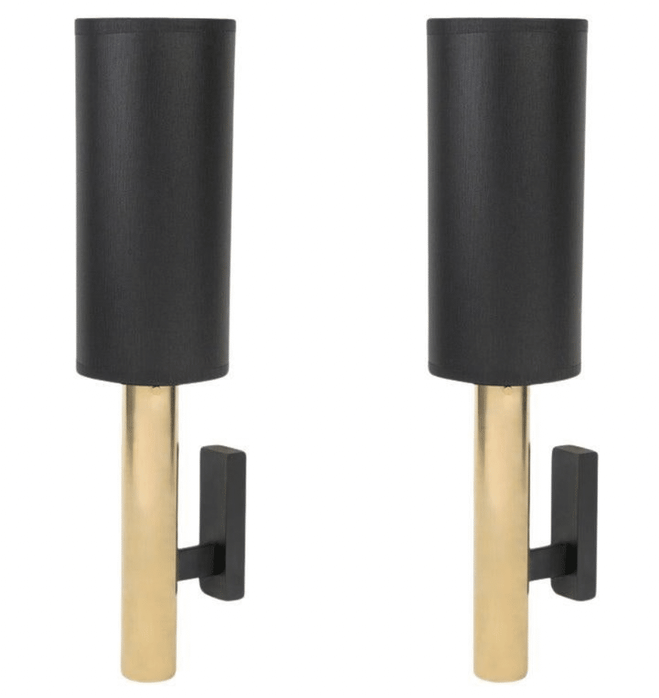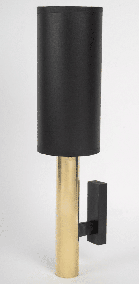Composées d’un support mural rectangulaire noir soutenant le bras cylindrique en laiton doré situé au bas de l’applique et habillé d’un abat-jour en coton noir assorti à la forme de l’applique, reposant sur 4 tiges en laiton doré situées au sommet du bras.