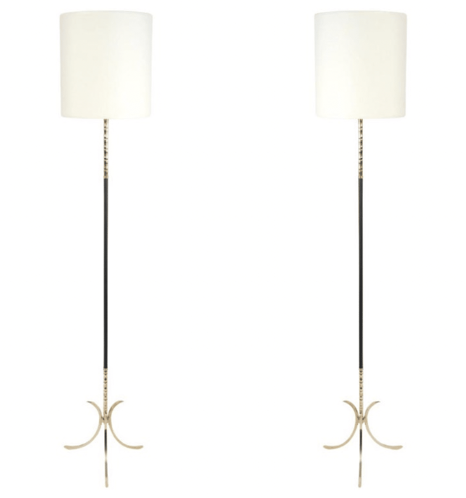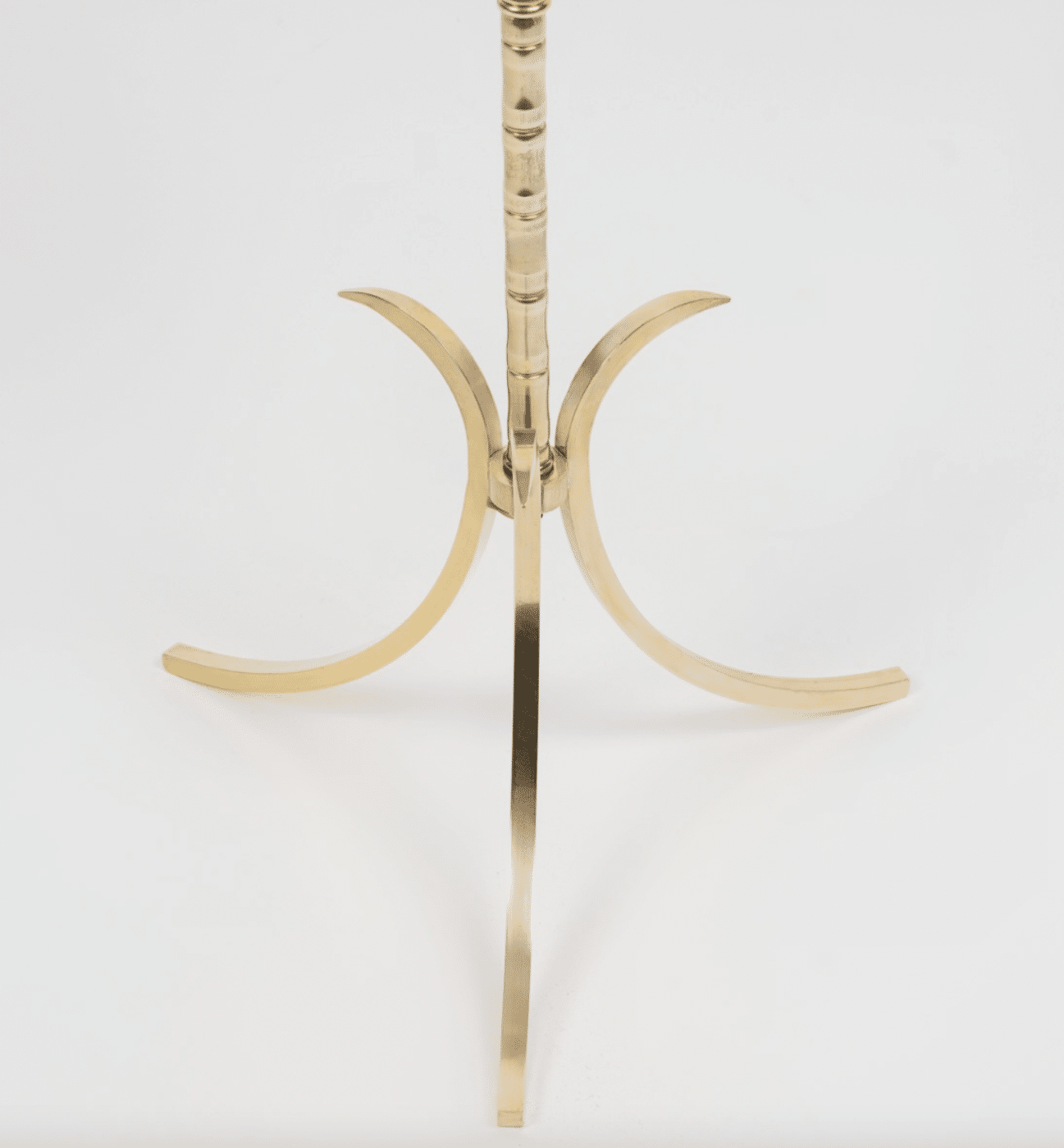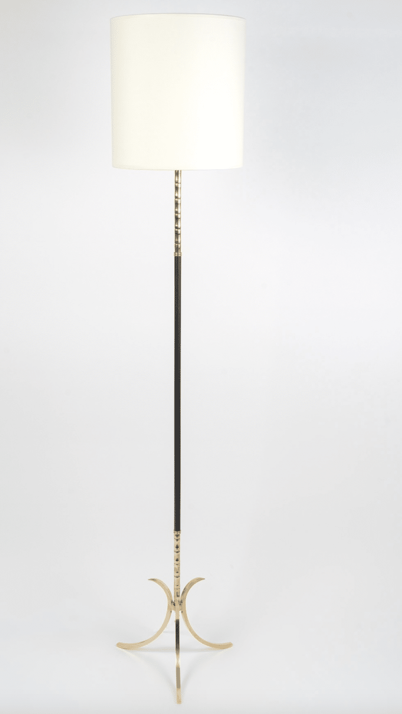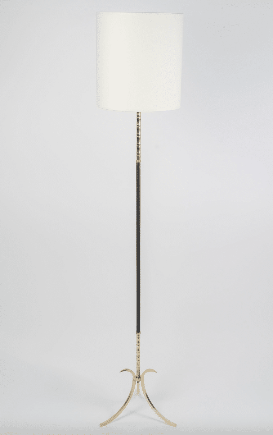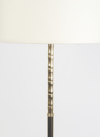 Composé d’une tige centrale en fer forgé noir ornée à son sommet d’une tige en laiton doré de style bambou, il repose sur un trépied formé de demi-boucles en laiton doré.