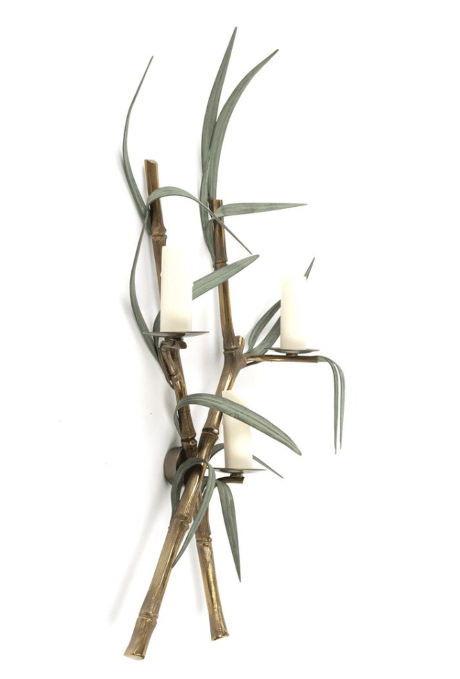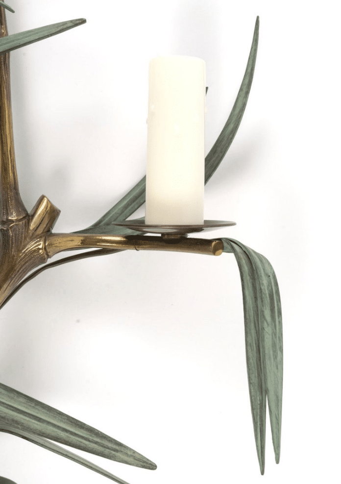 Composées de deux branches entrelacées en bronze doré imitant le bambou, décorées de feuillage vert (modèle rare en vert) sur lesquelles reposent trois bougies.