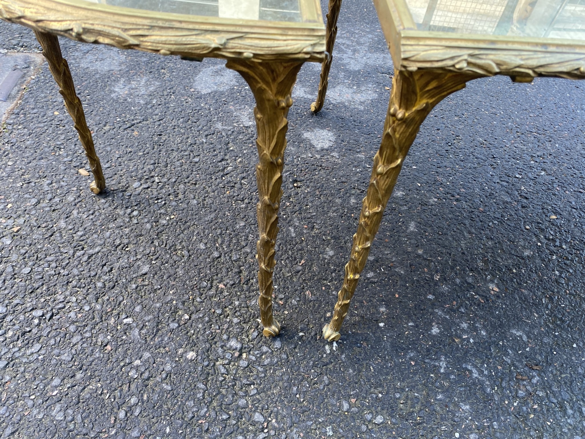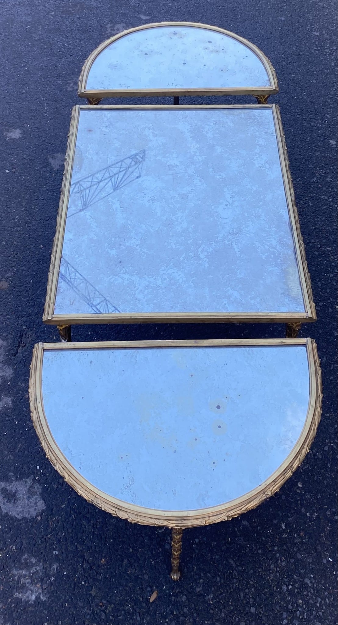 Table Tripartite Maison Charles en bronze doré avec plateau en miroirs vieillis vintage, montants décor palmier, Tout est vissé.