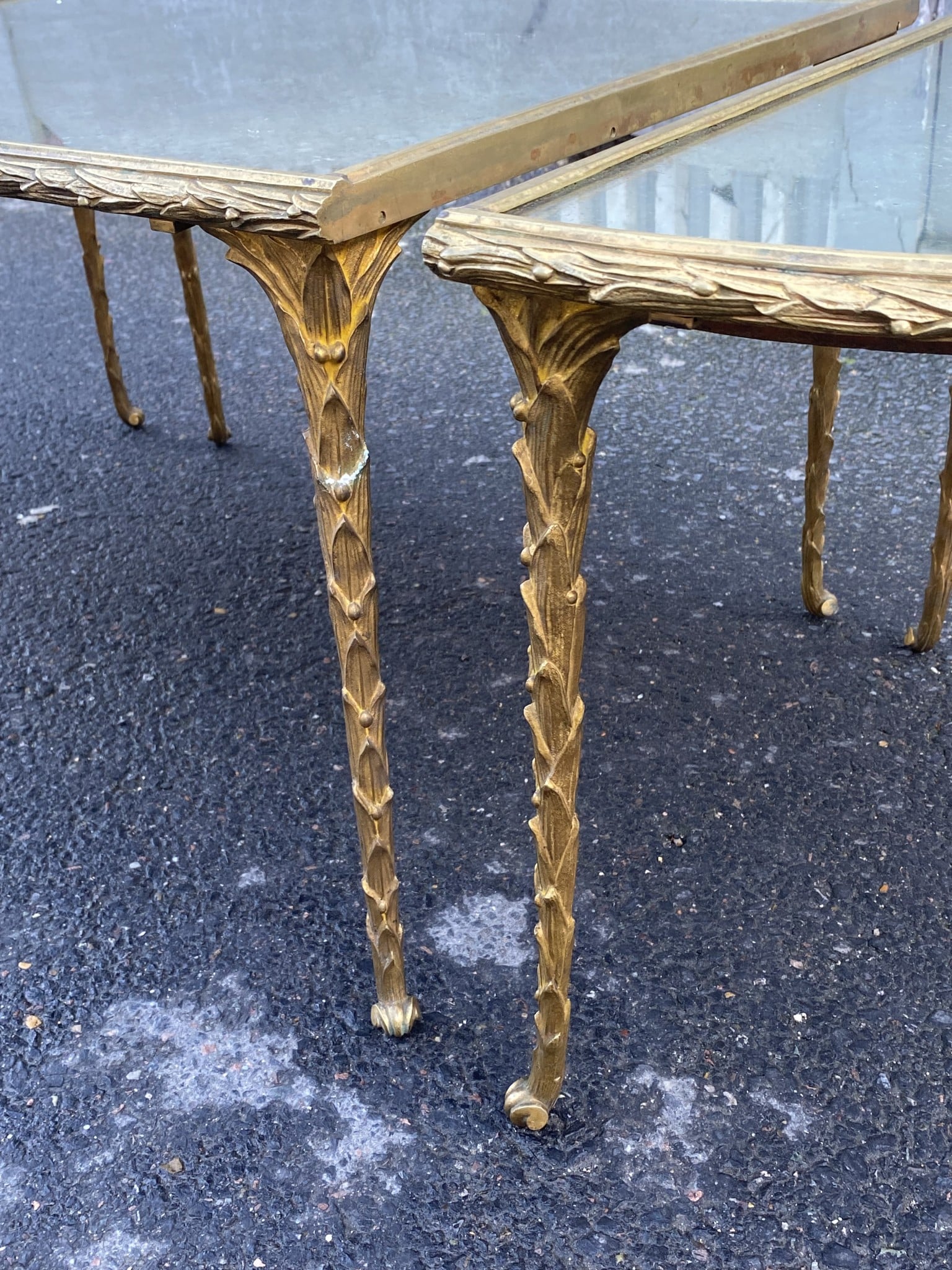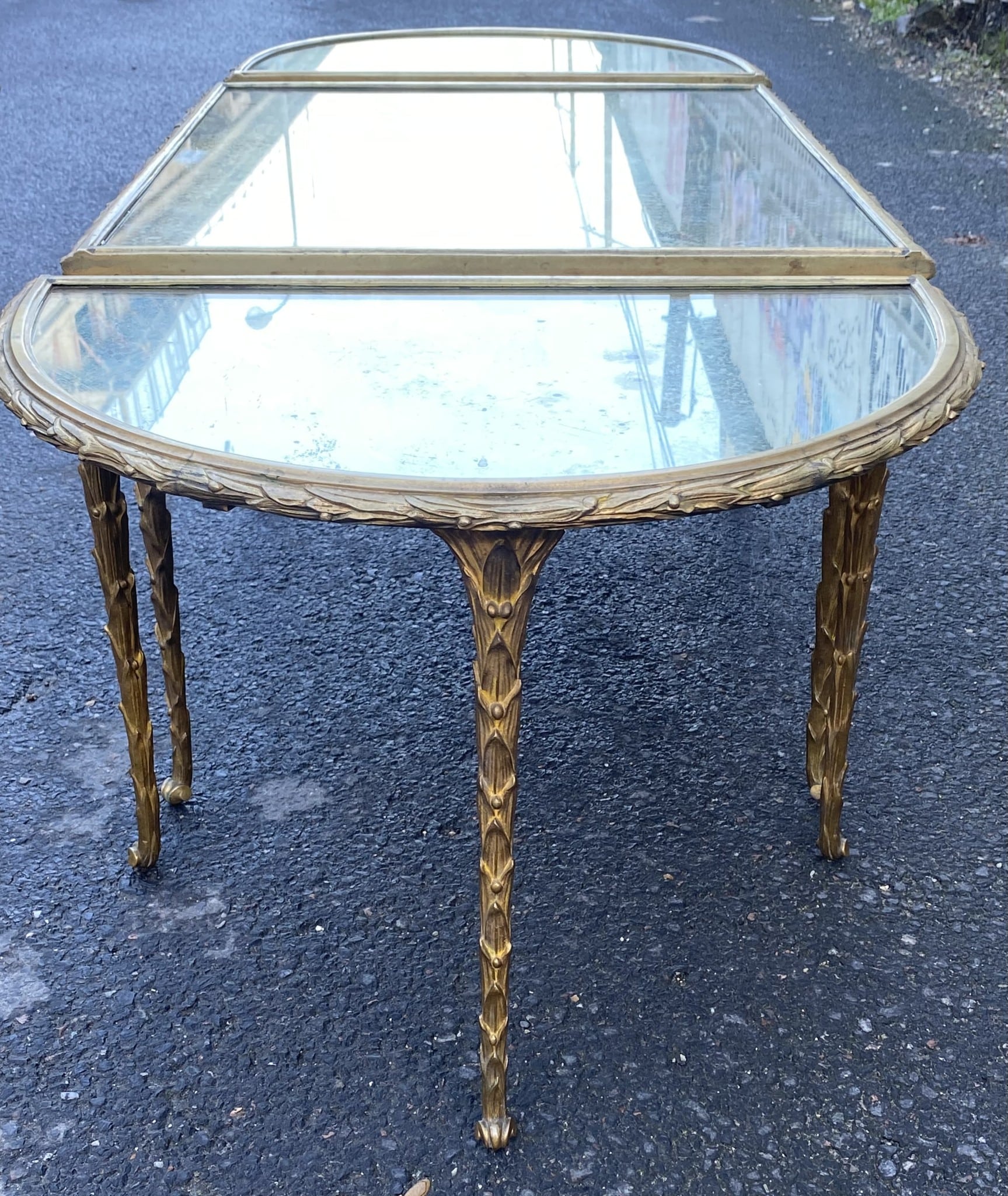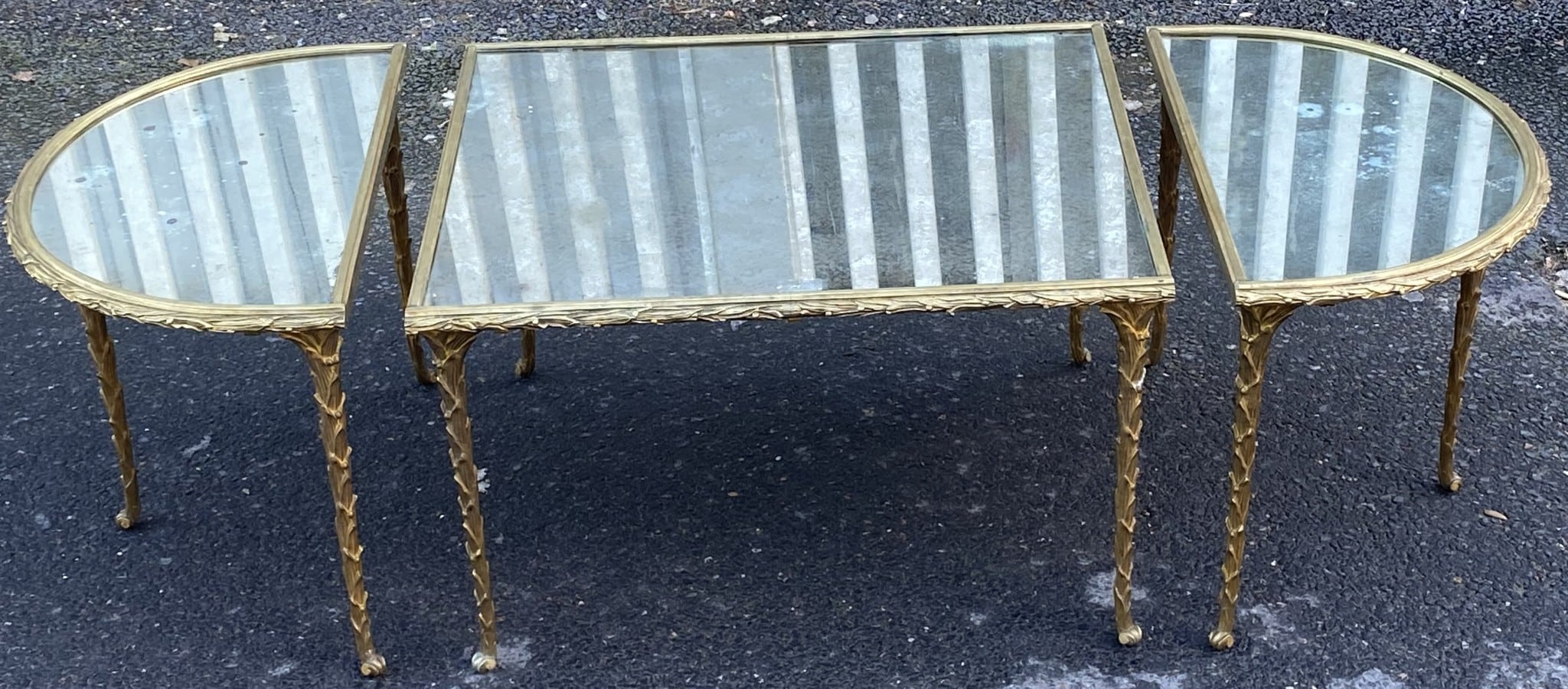 1970′ Table Tripartite Maison Charles, Jansen Ou Baguès Décor Palmier en Bronze Doré avec Plateaux Miroirs Vieillis