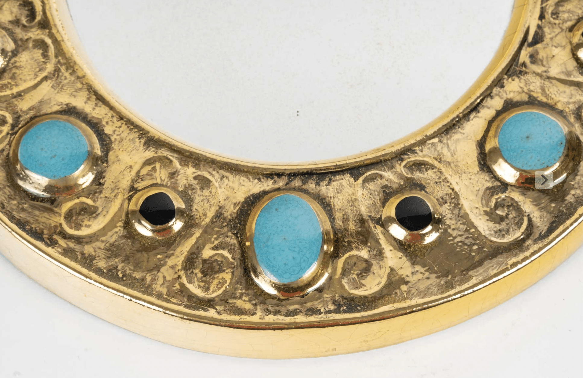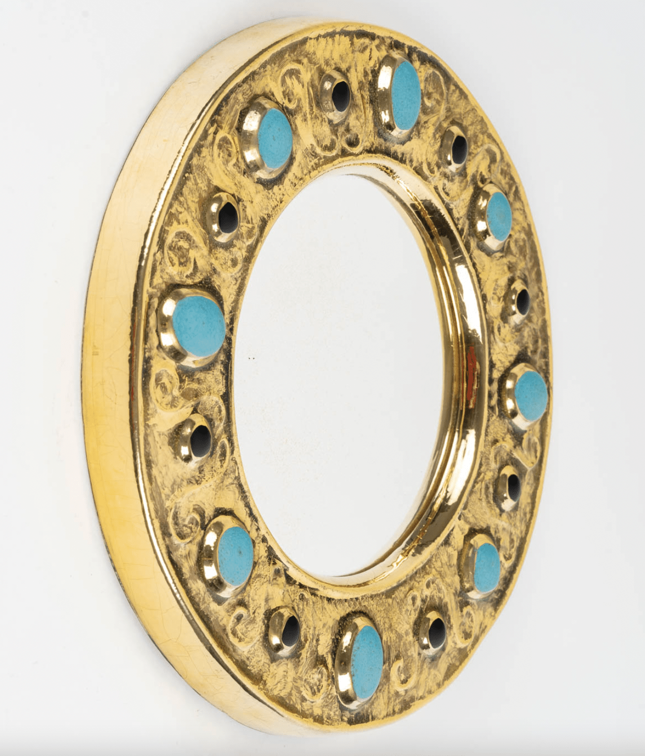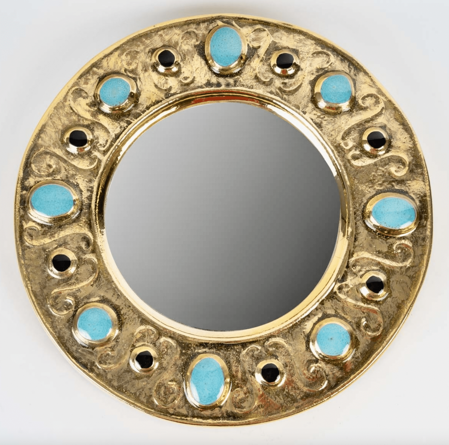 Miroir François Lembo, céramique, bijoux, or, vert émeraude, noir signé. Petit miroir circulaire, émaillé d’or, à décor de bijoux incrustés. Signé F. Lembo avec signature incisée au dos.