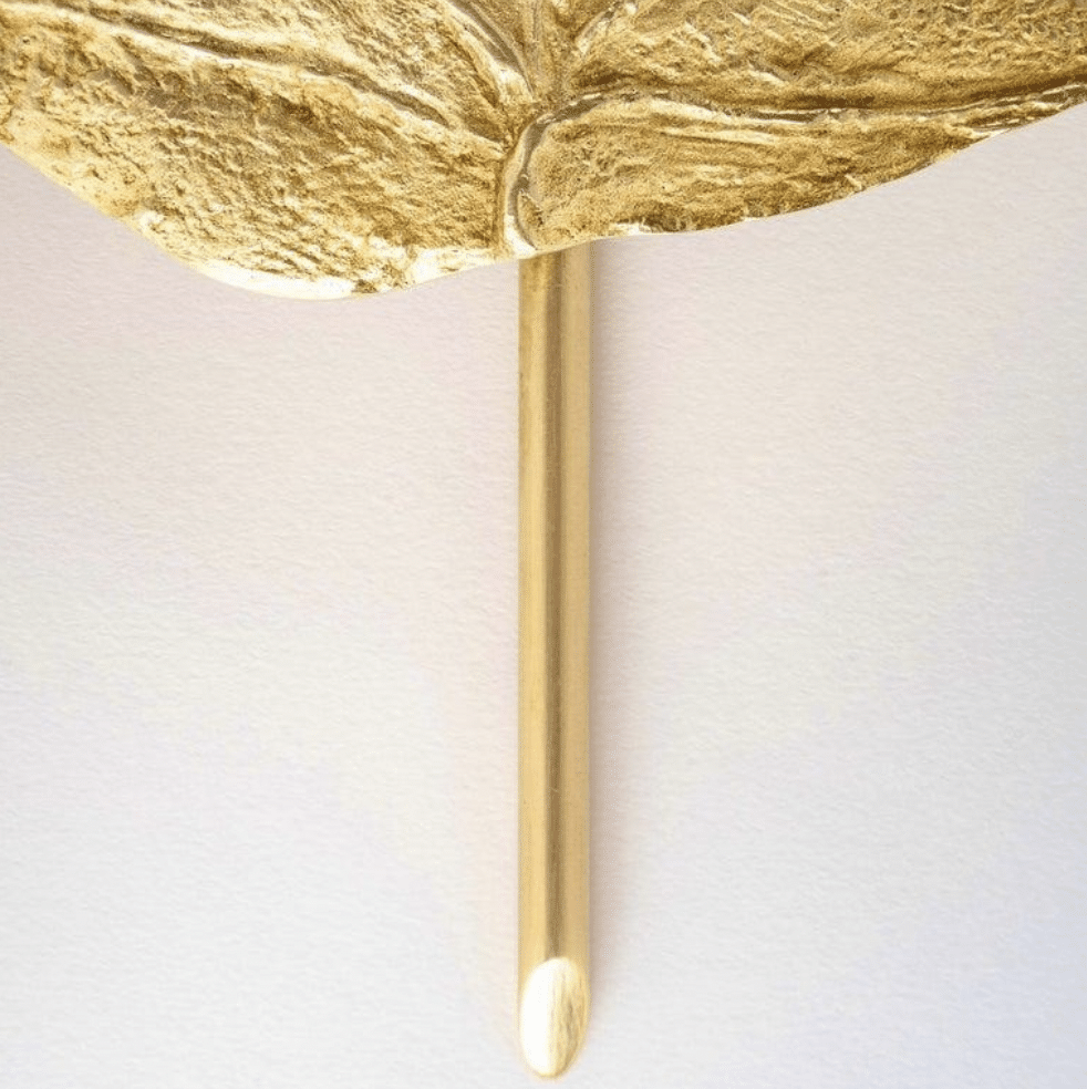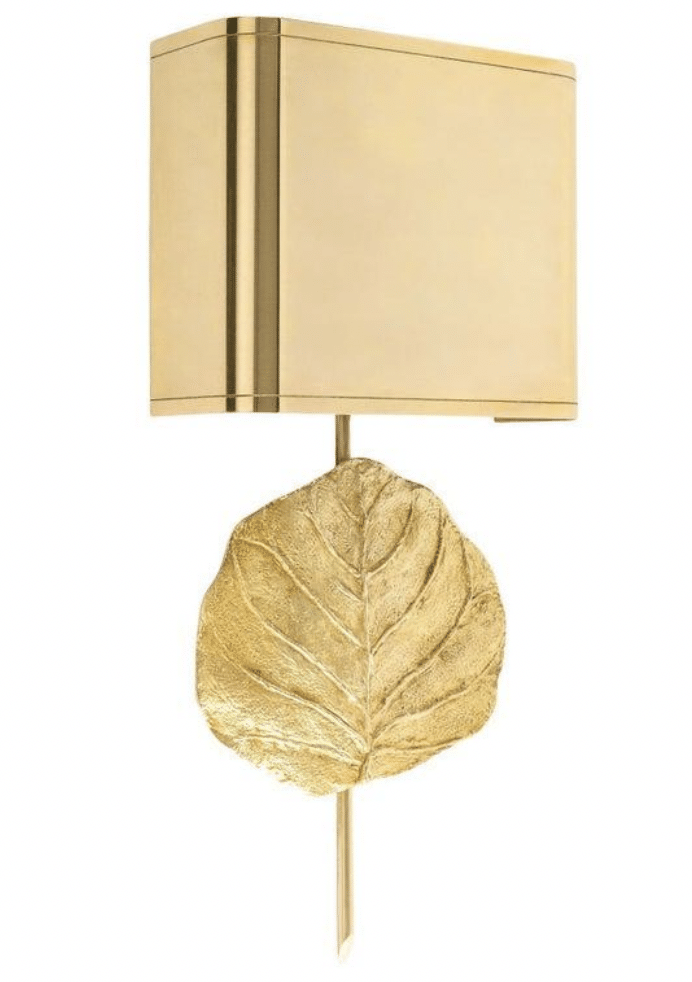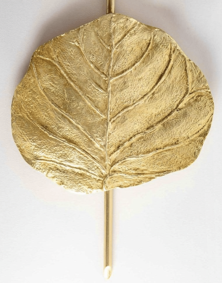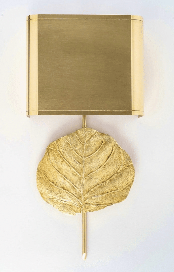 Composé d’une longue tige ronde en laiton doré soutenant dans sa partie inférieure une jolie feuille de nénuphar nervurée en bronze doré et habillée dans sa partie supérieure d’un écran original en laiton doré.