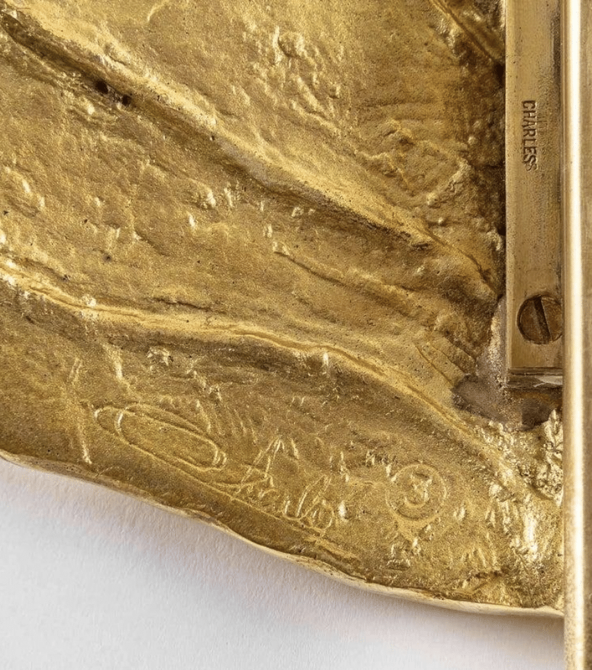 Paire d’appliques modèle Clea par Chrystiane Charles pour Maison Charles. Version luxueuse du modèle, abat-jour avec bordure et montage de haute qualité. Bronze doré, signé C. Charles au dos des feuilles.