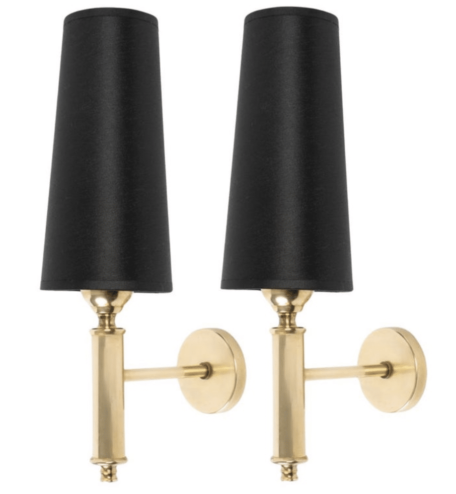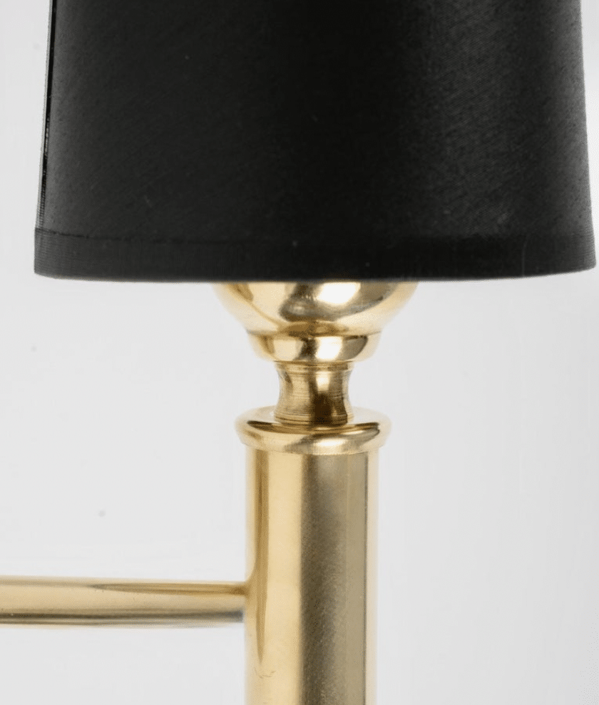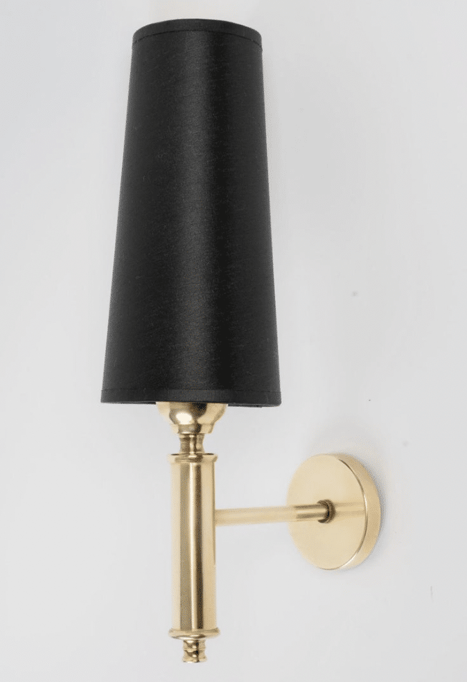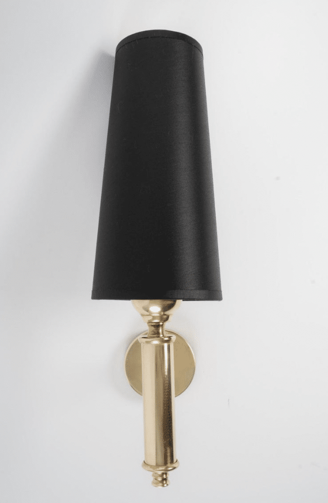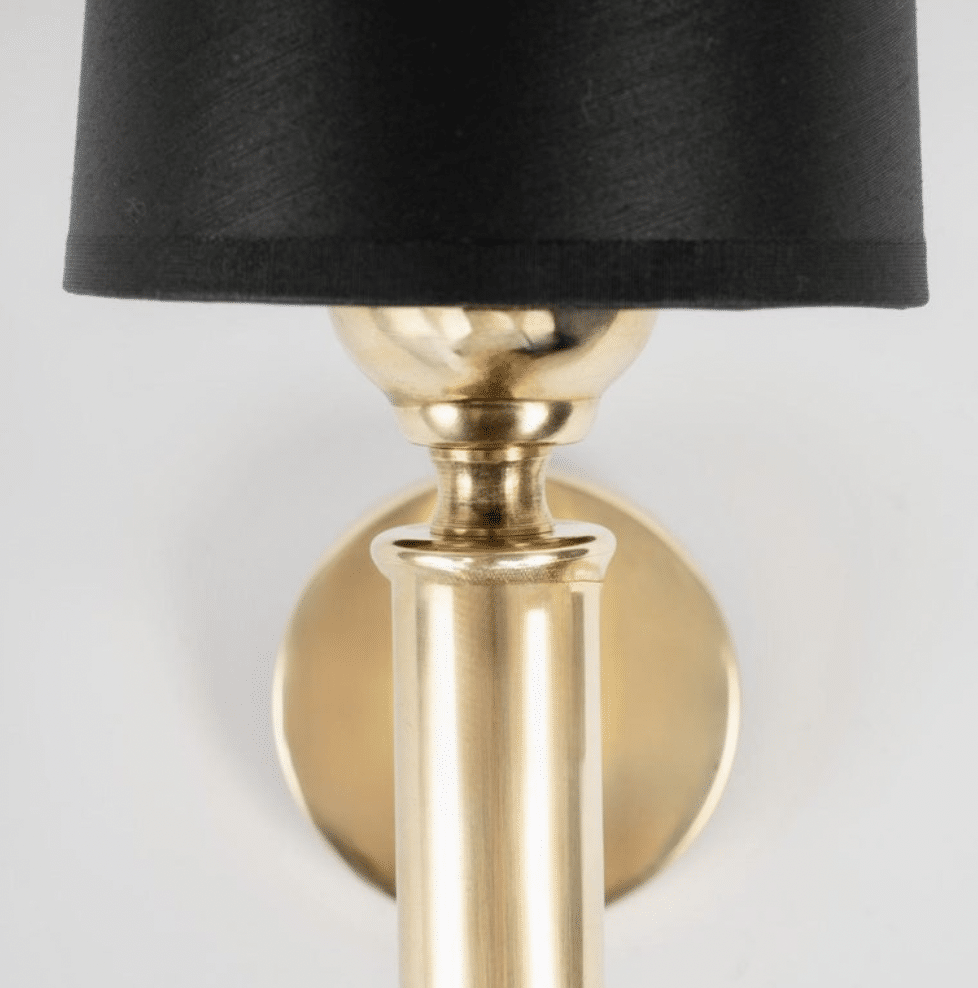 À son sommet, un abat-jour trapézoïdal en coton noir à l’extérieur et doré à l’intérieur orne élégamment l’applique murale.