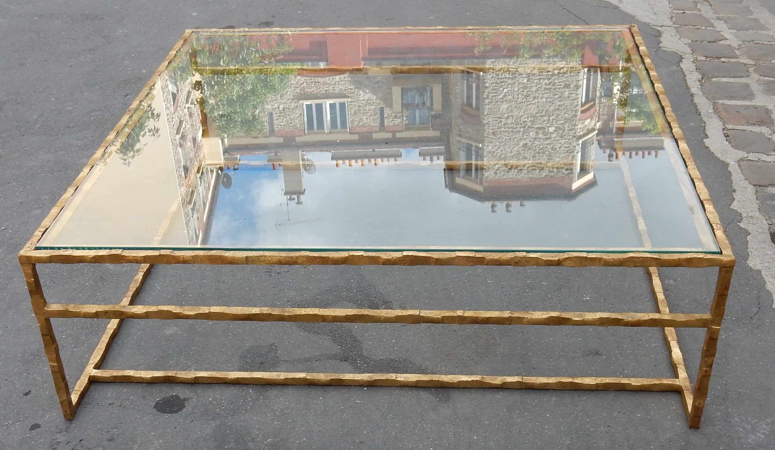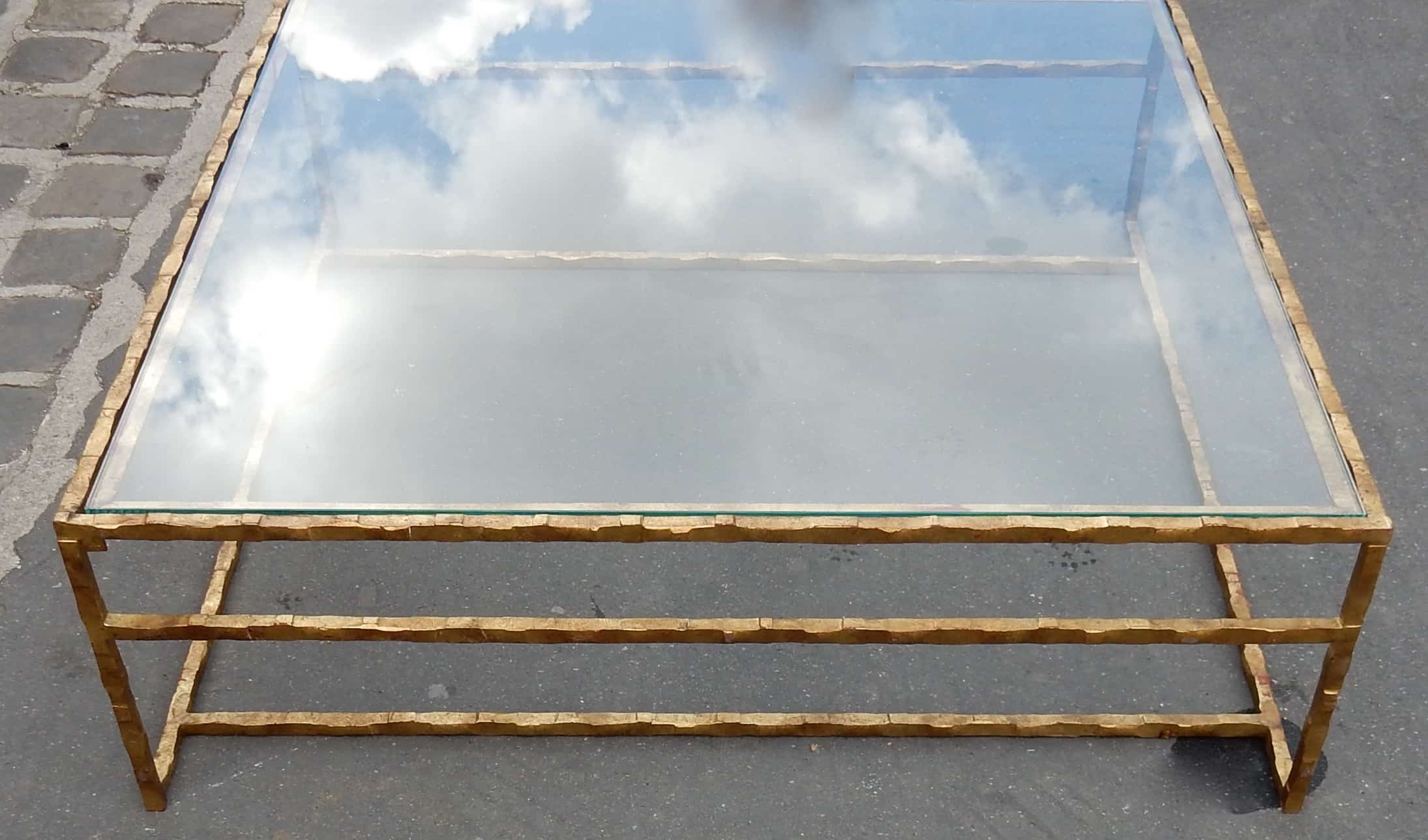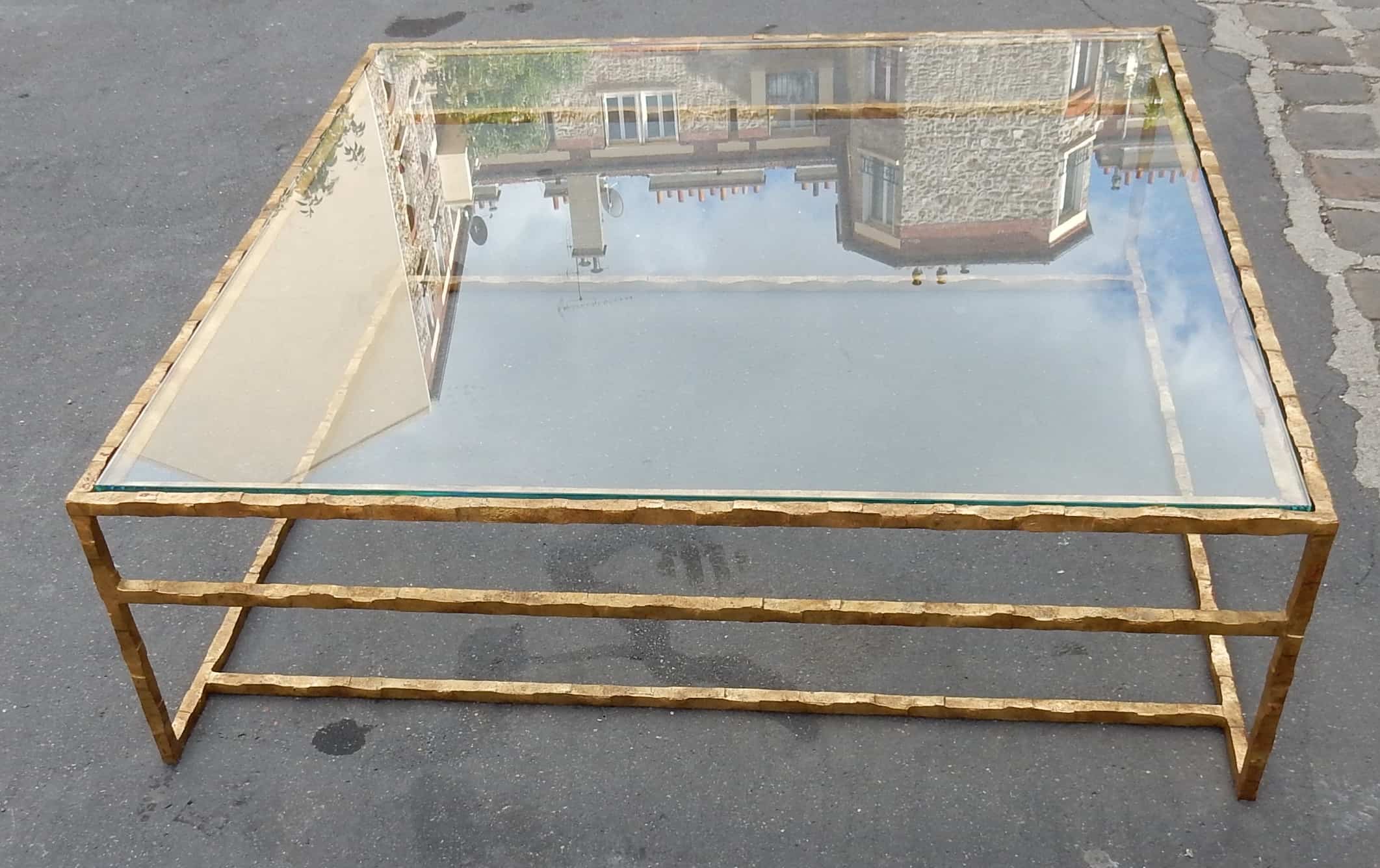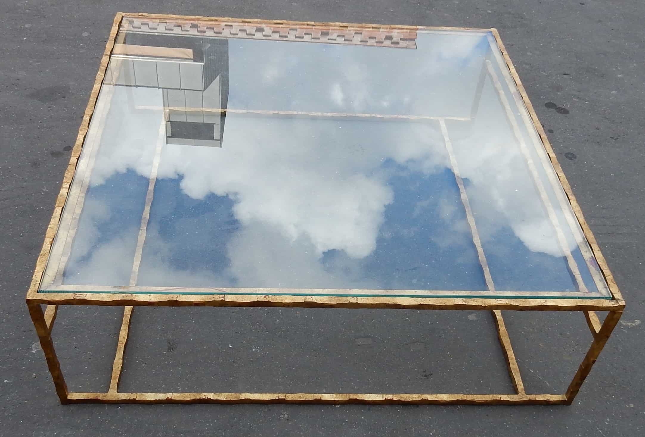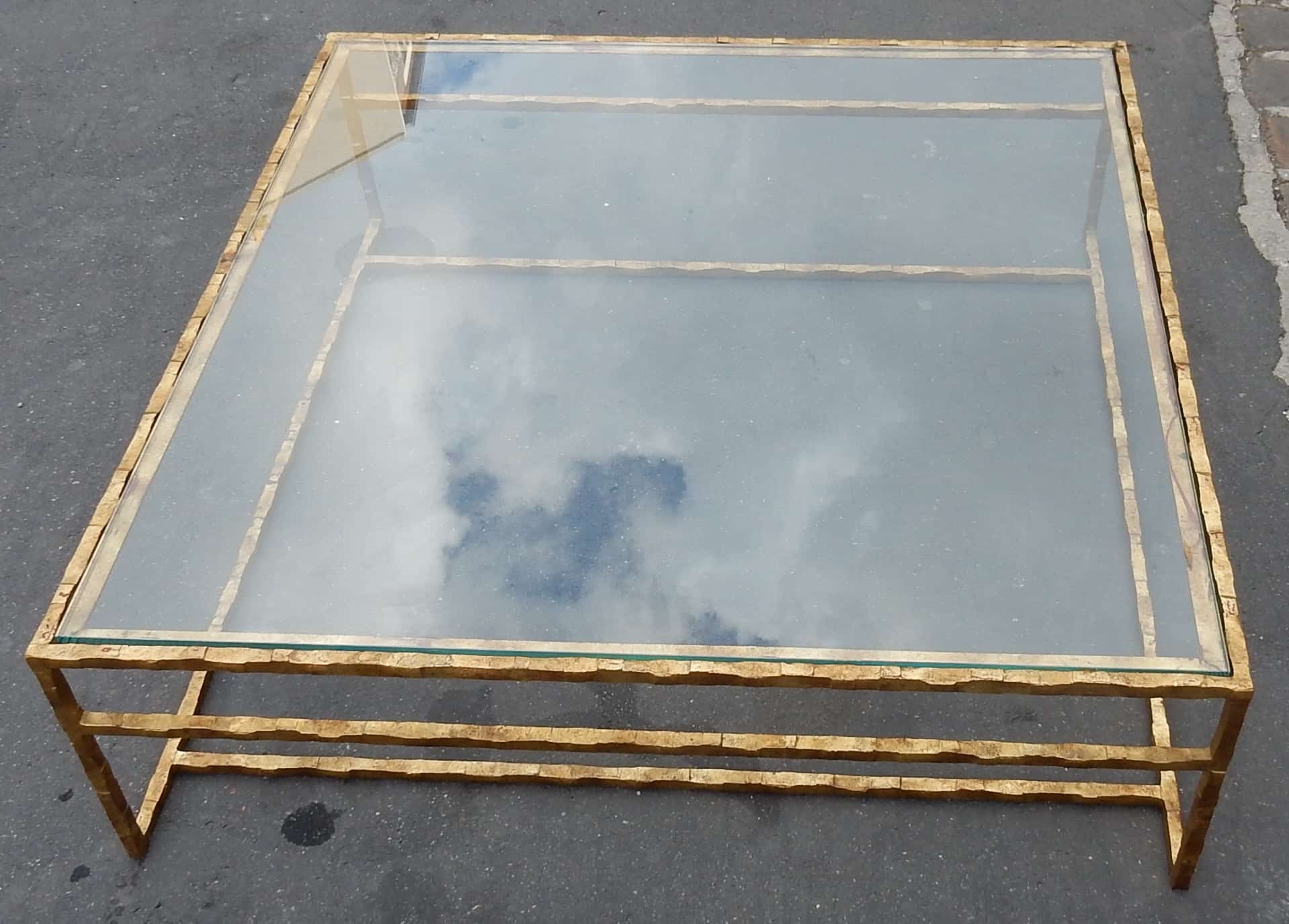 Table basse structure fer forgé a décor végétal dorée a la feuille d or , dalle de verre, Bon état