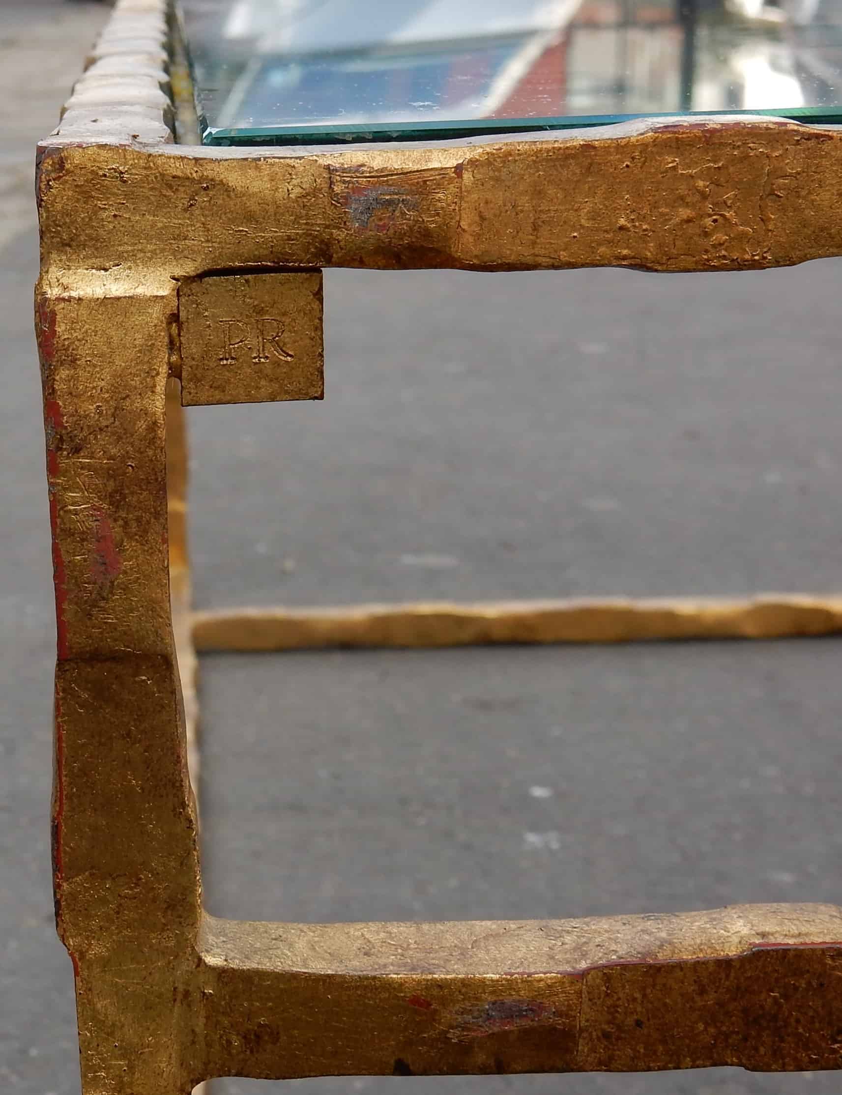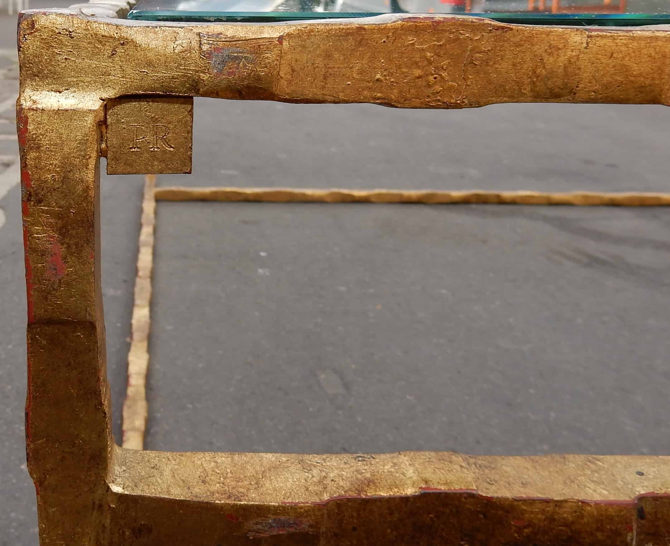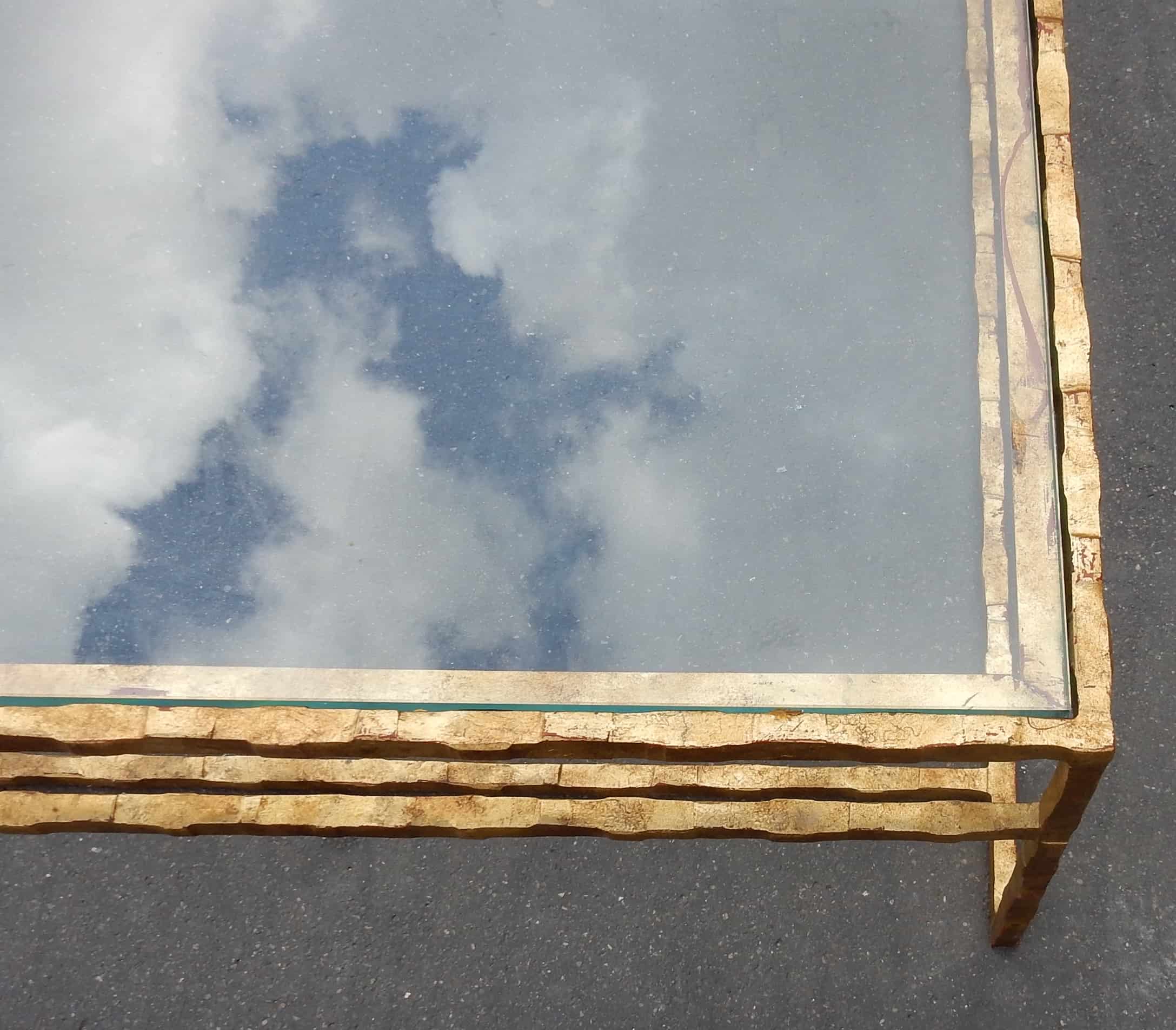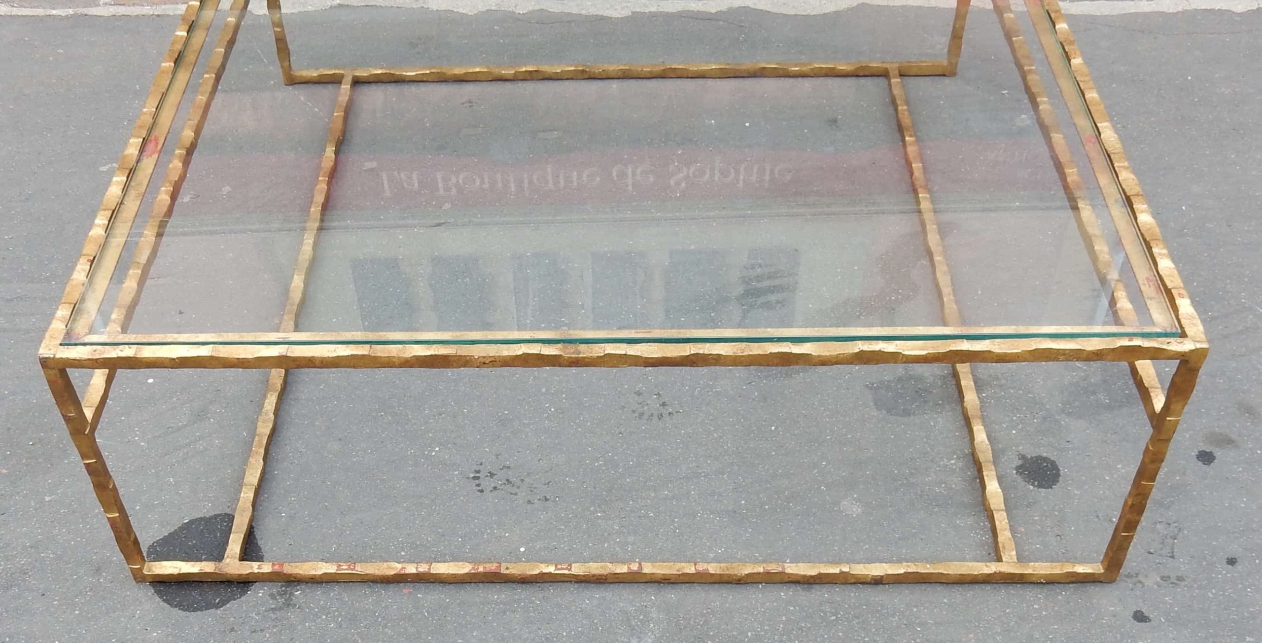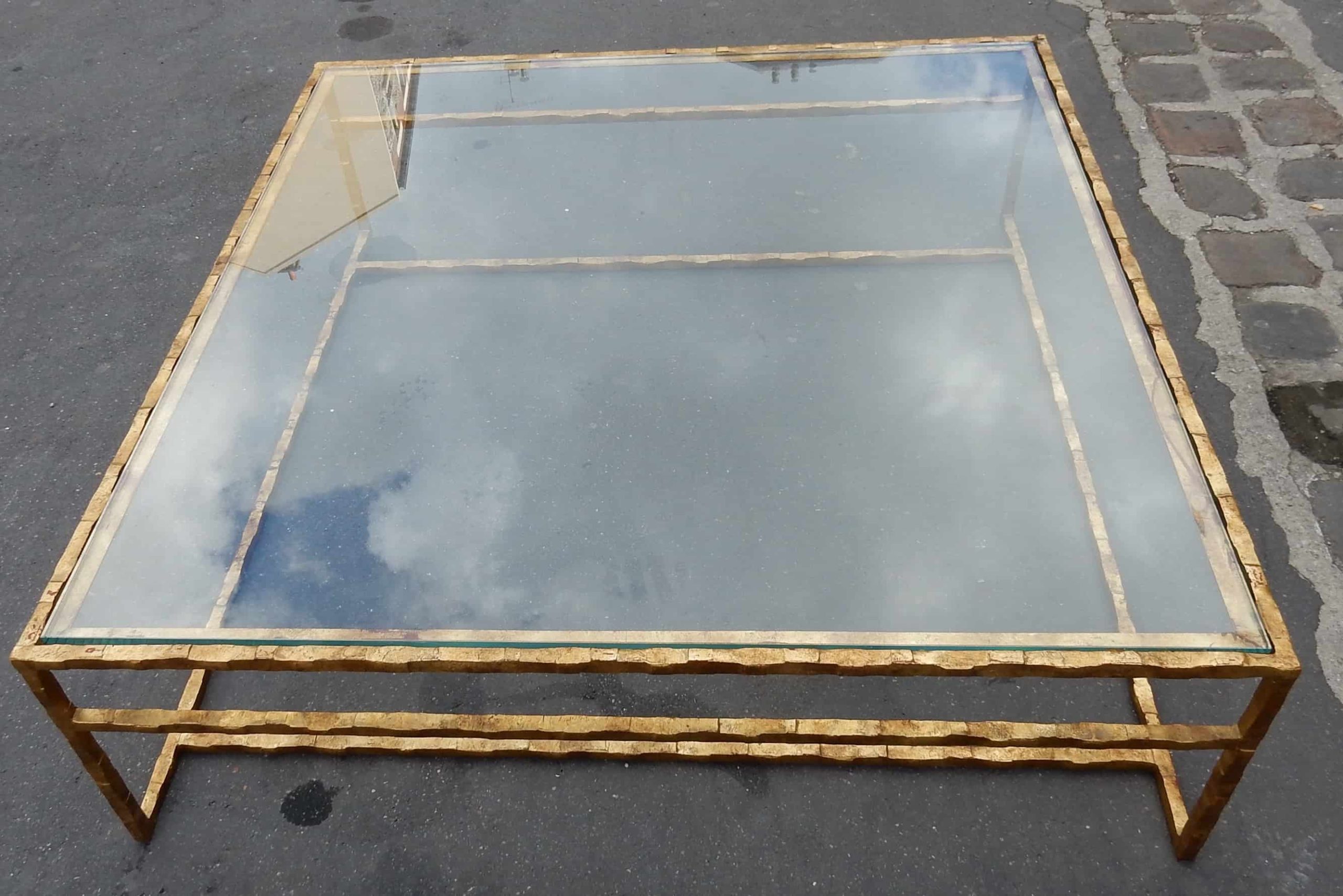 Table basse structure fer forgé a décor végétal dorée a la feuille d or , dalle de verre, Bon état