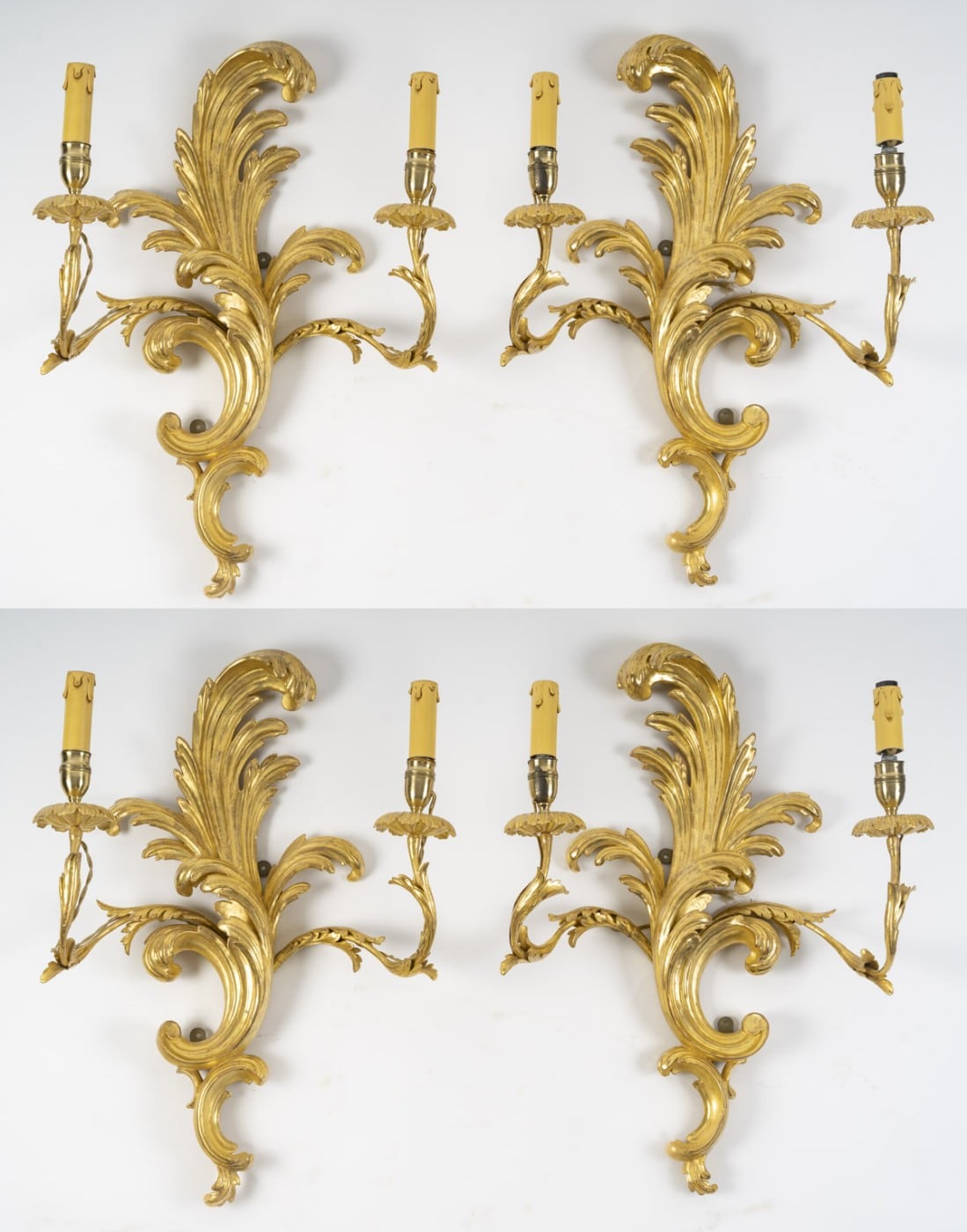 Grandes et élégantes suite de 4 appliques en bois sculpté et doré à la feuille d’or.