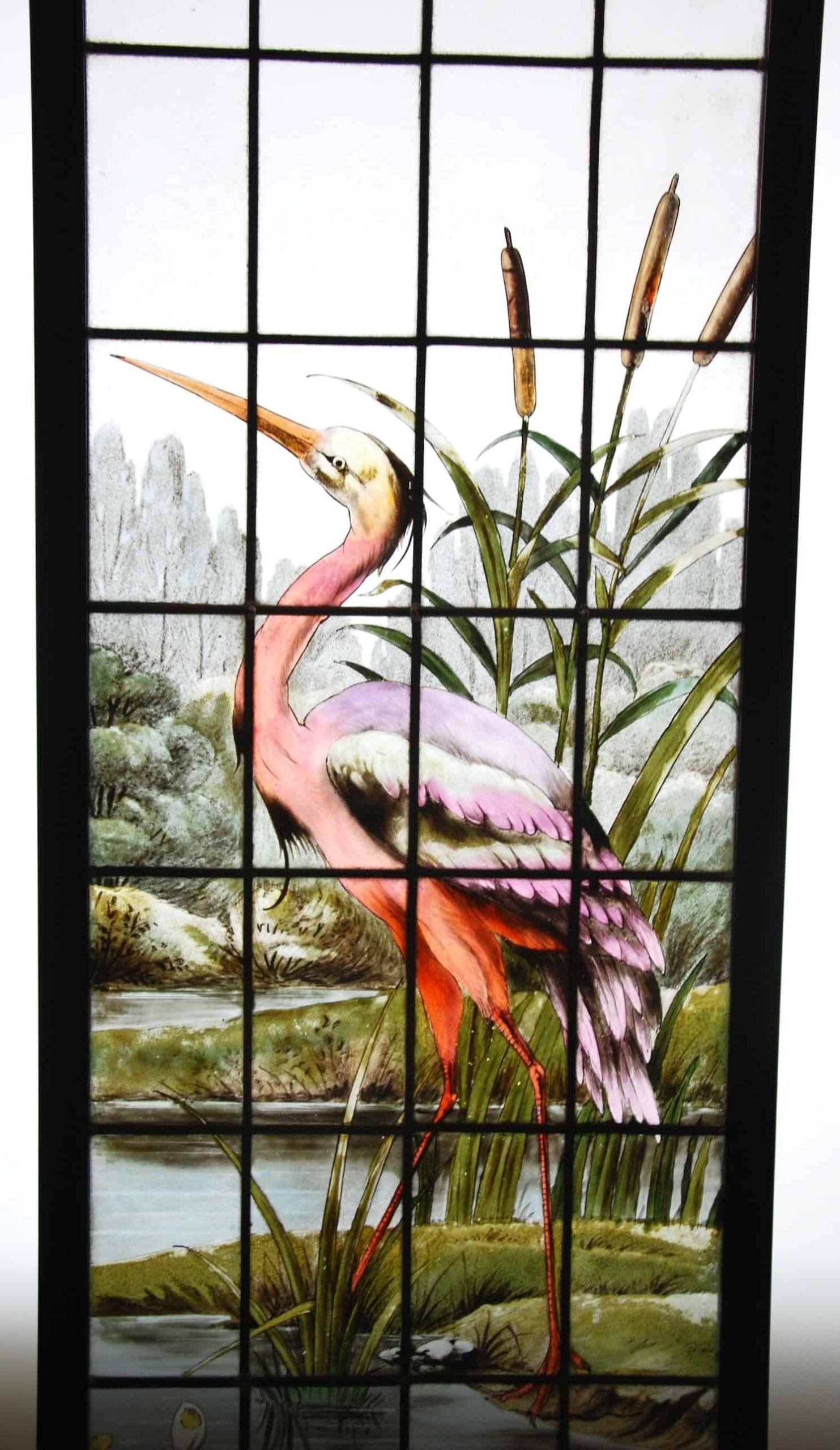 Deux paires de vitraux en verres granités à l’acide peints à la grisaille et à l’émail, représentant des scènes au bord de l’eau animées d’un ibis et d’un oiseau entourés de rose trémière et de roseaux, dans le haut une clématite violette, la deuxième paire représente un héron, un oiseau et un papillon entourés de roseaux et d’iris, dans le haut une capucine descend sur la scène.