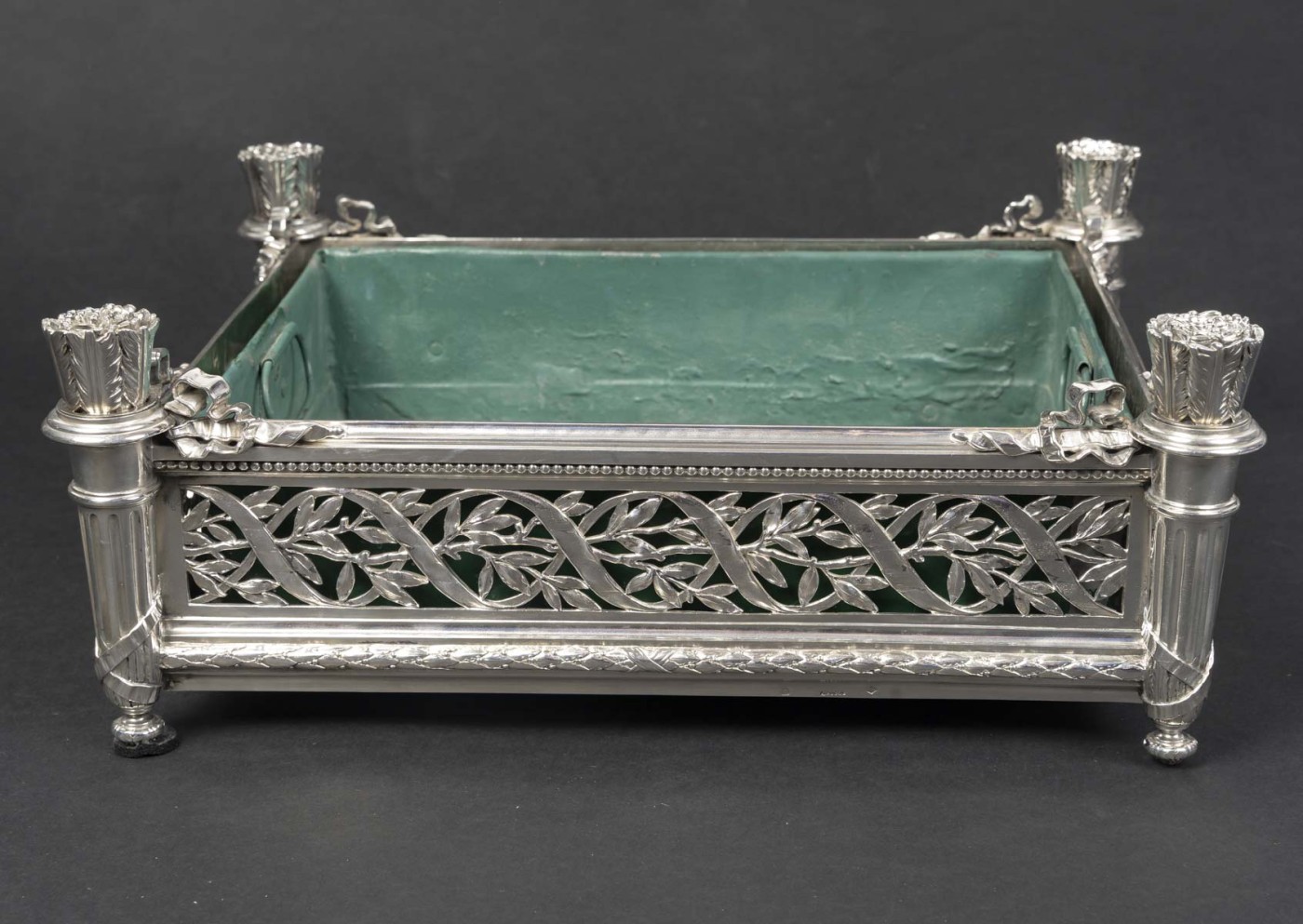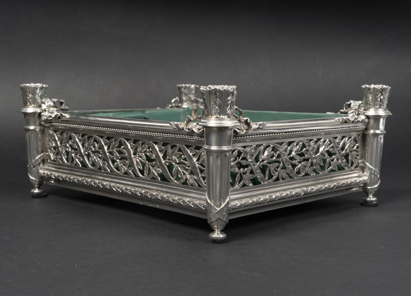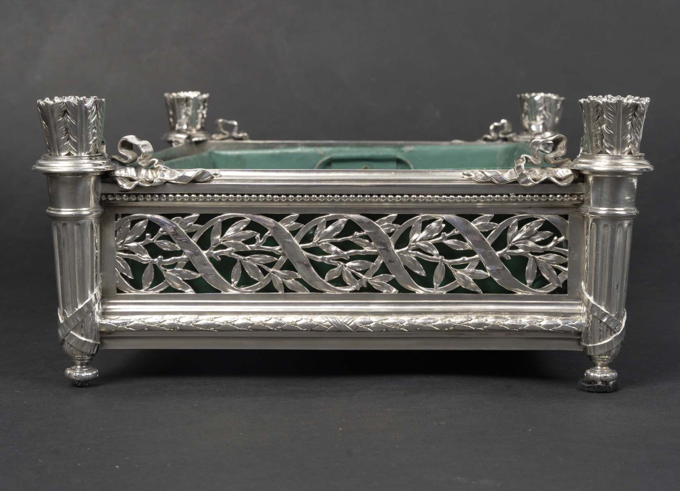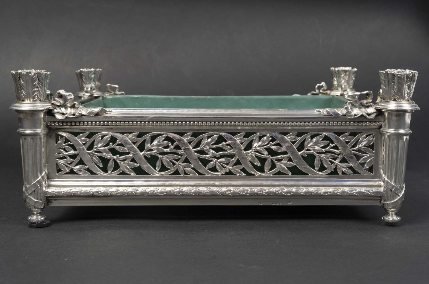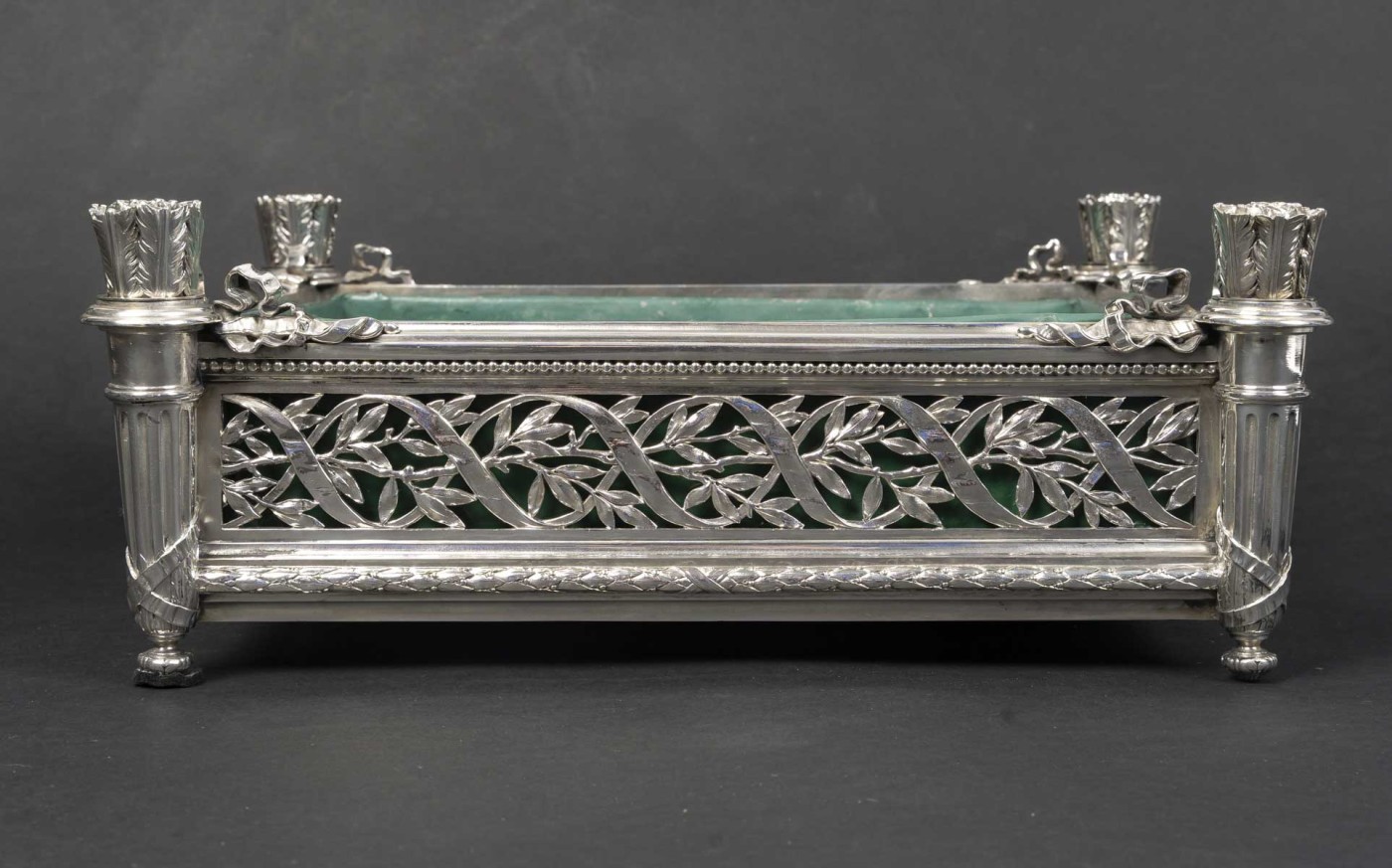 Jardinière rectangulaire en argent massif de forme rectangulaire reposant sur quatre pieds d’angle. Montants d’angle figurant des carquois stylisés, à décor de feuilles lancéolées, reposant sur des bases fuselées et terminés par de petites bobèches feuillagées.