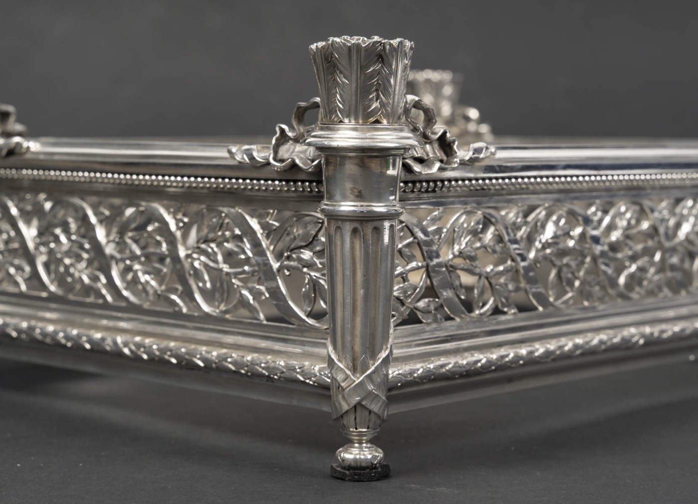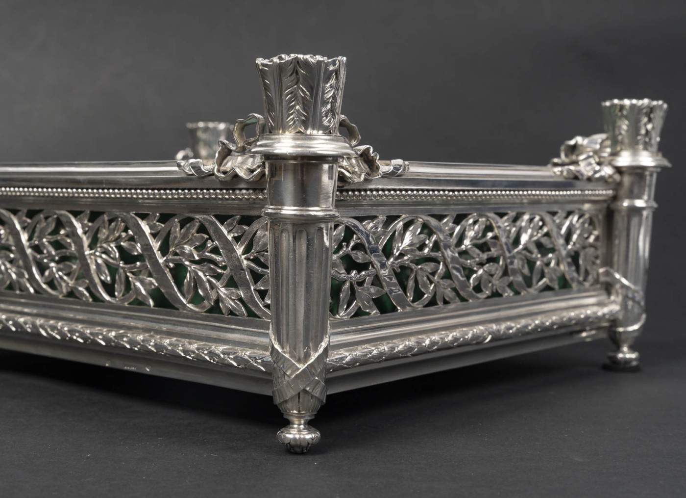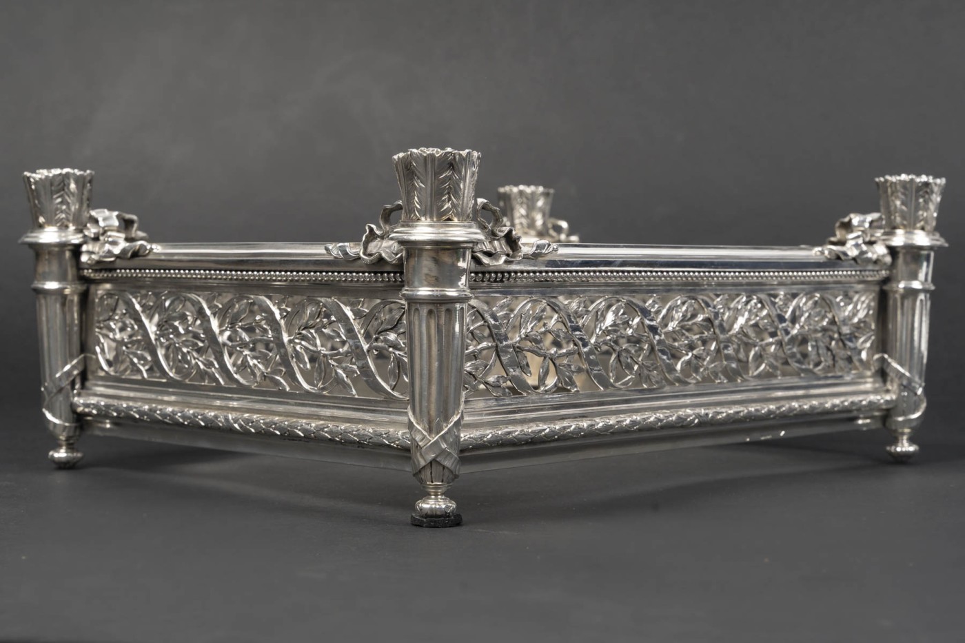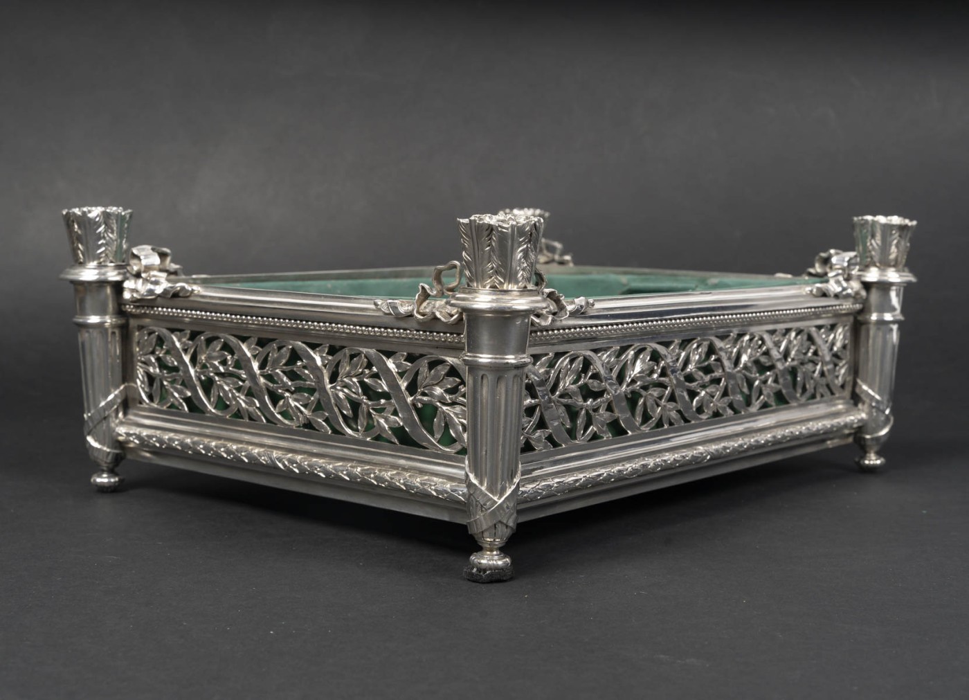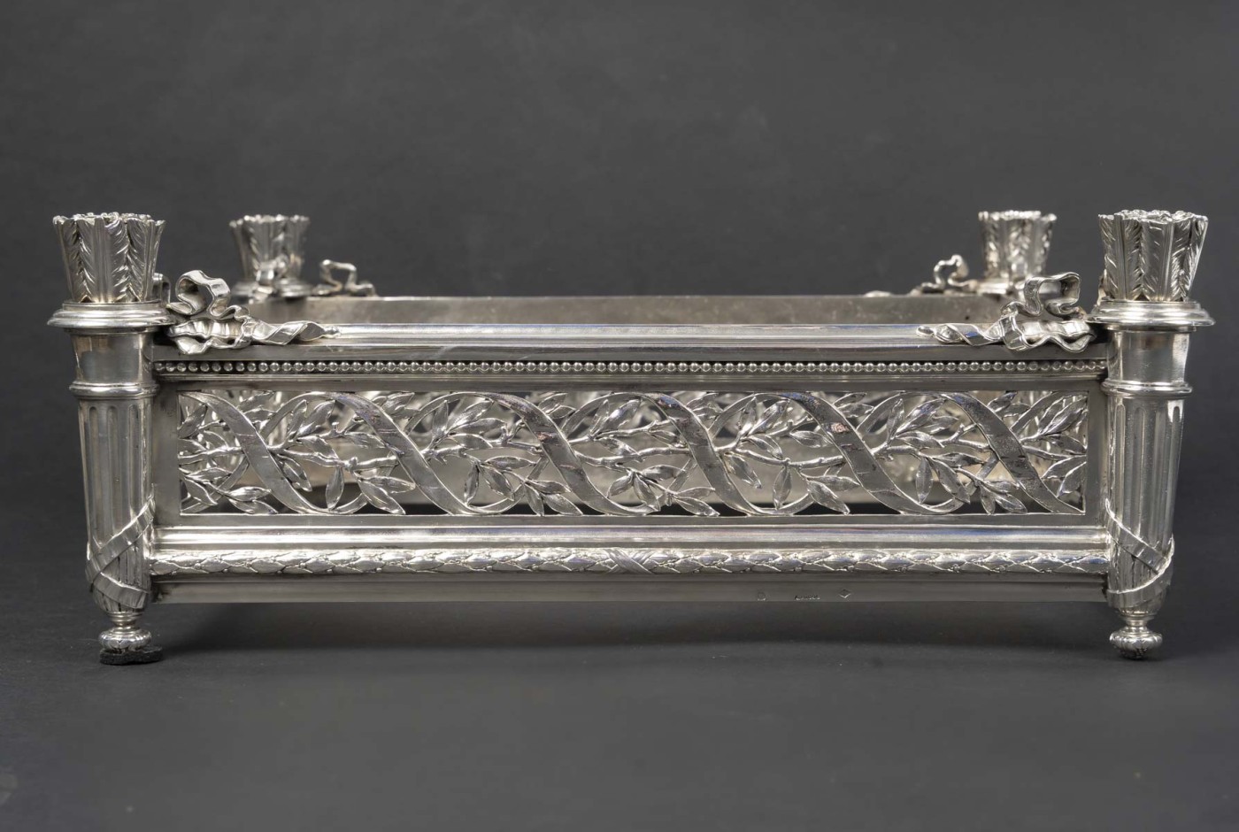 Jardinière rectangulaire en argent massif de forme rectangulaire reposant sur quatre pieds d’angle. Montants d’angle figurant des carquois stylisés, à décor de feuilles lancéolées, reposant sur des bases fuselées et terminés par de petites bobèches feuillagées.