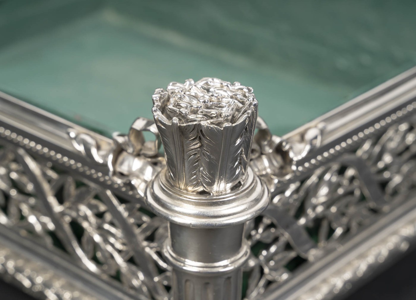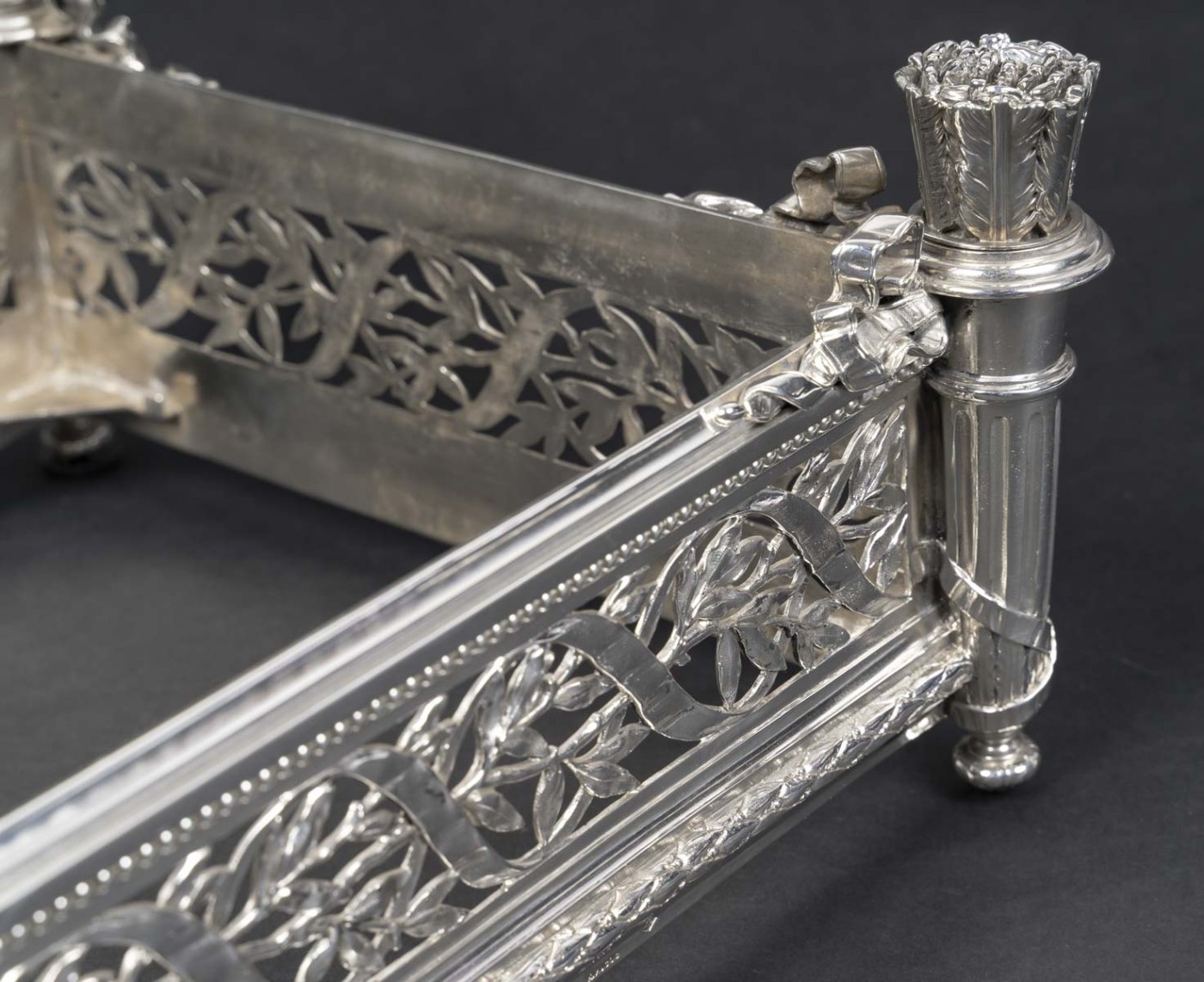 Les quatre faces présentent un remarquable travail d’ajourage à décor de rinceaux, enchevêtrement symétrique de feuillages et volutes formant un treillage ondulant.