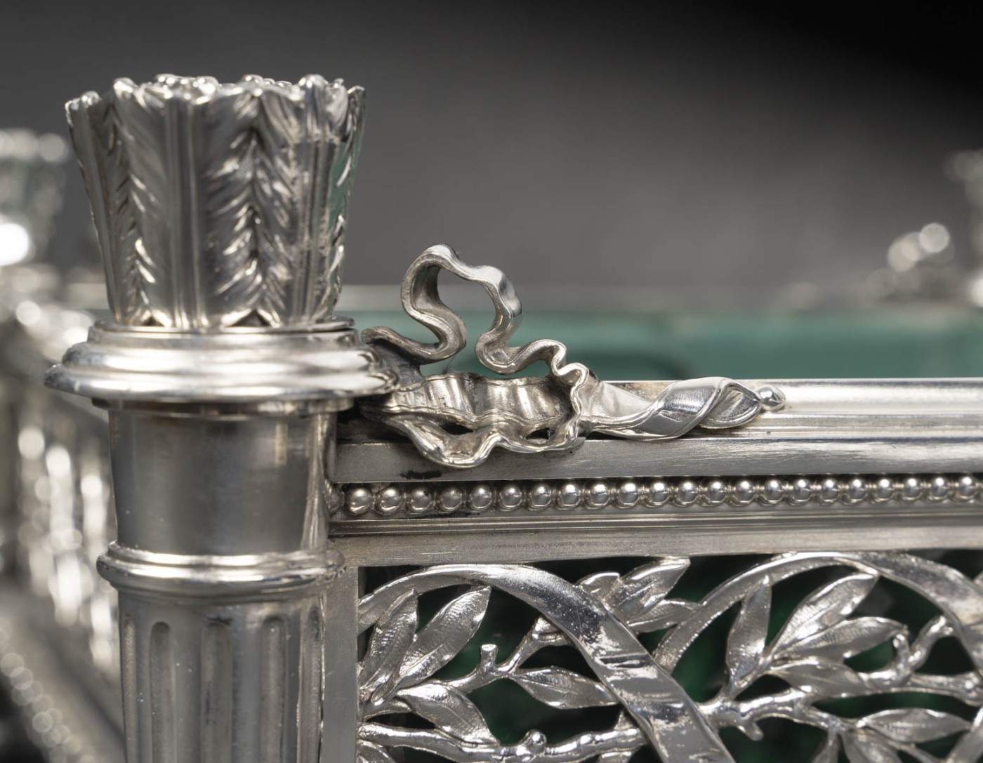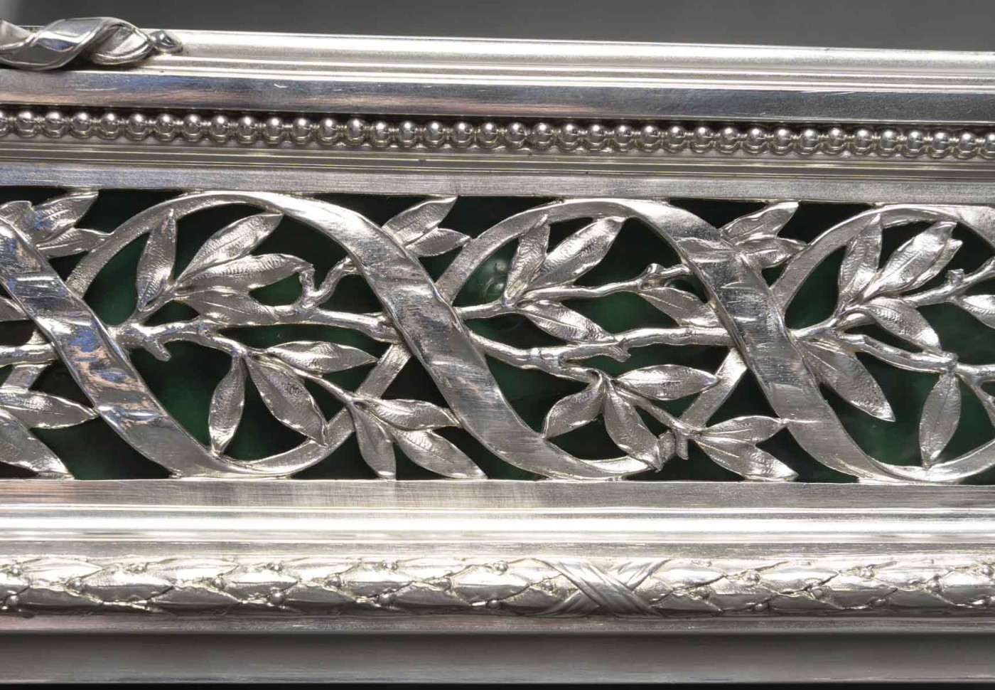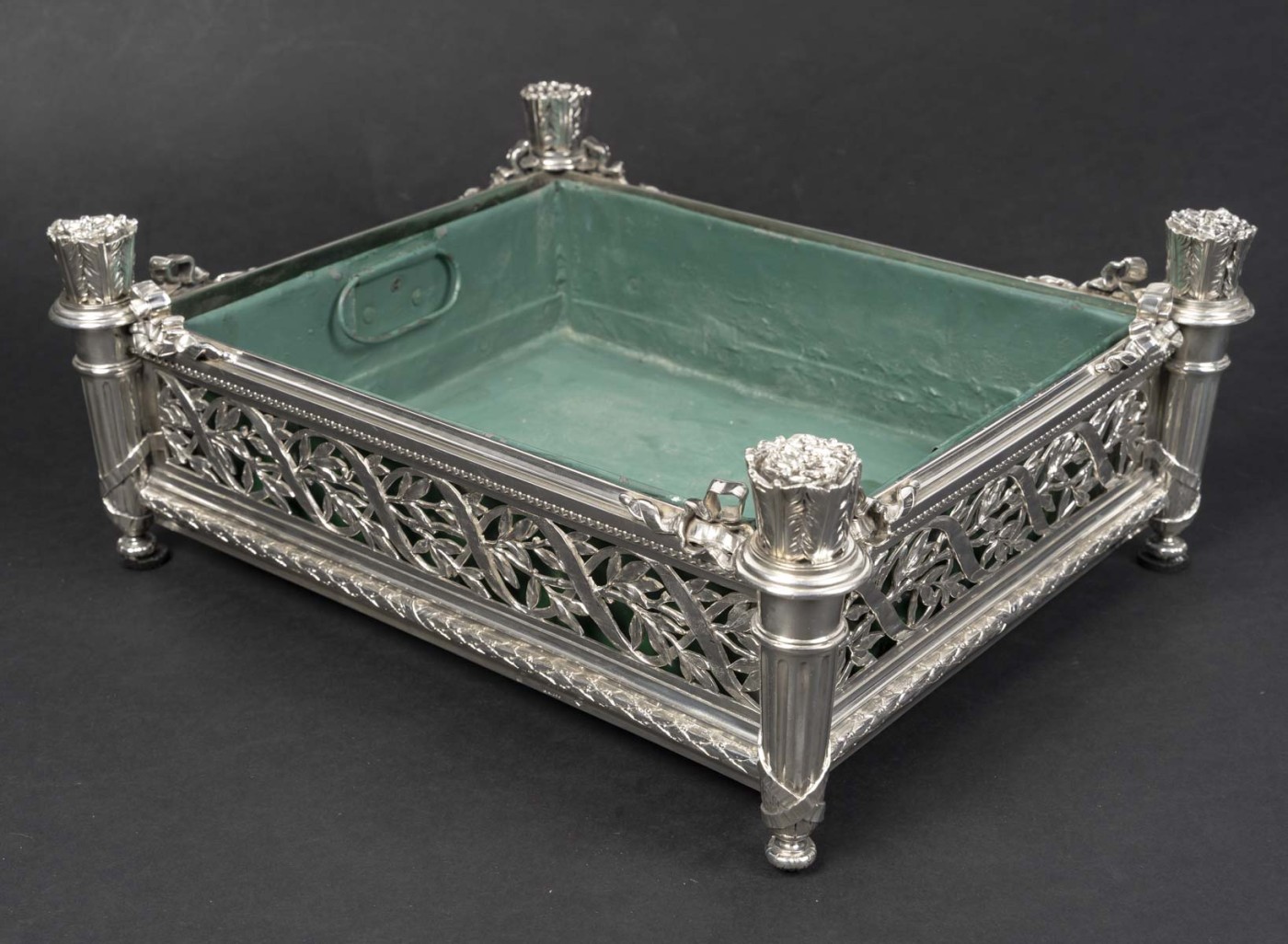 La jardinière conserve son bac intérieur en zinc, peint en vert, destiné à protéger l’argent de l’humidité. Cet élément d’origine renforce son authenticité et son usage fonctionnel. L’ensemble témoigne d’un excellent travail de ciselure et d’assemblage, caractéristique des grandes maisons parisiennes